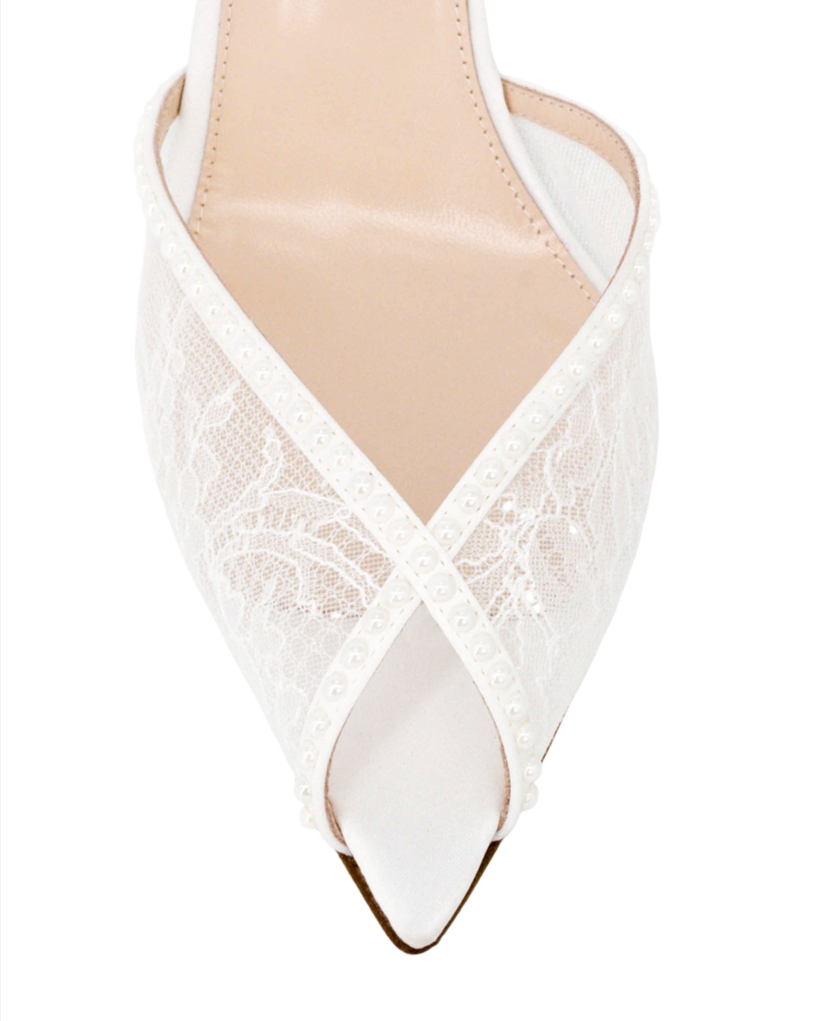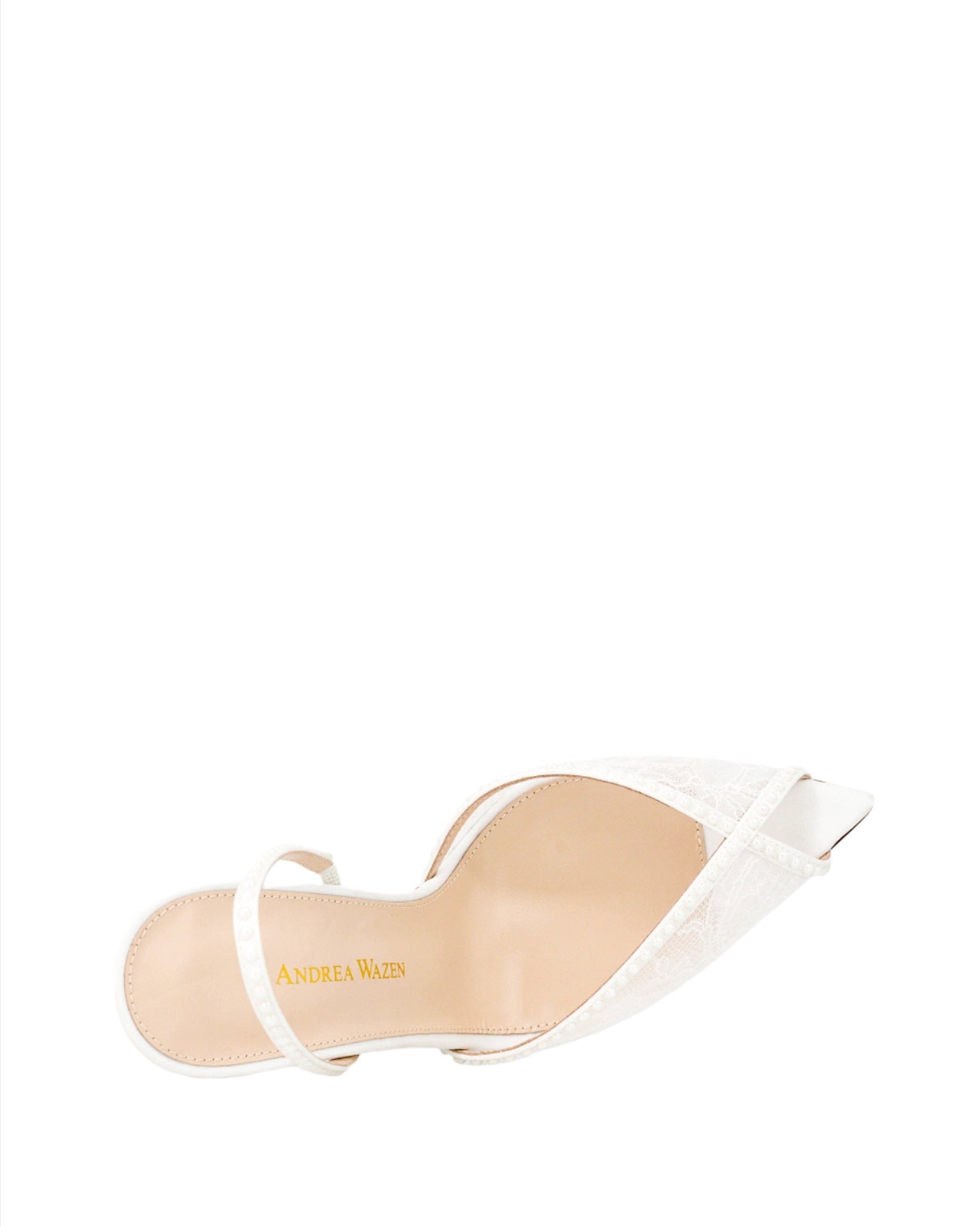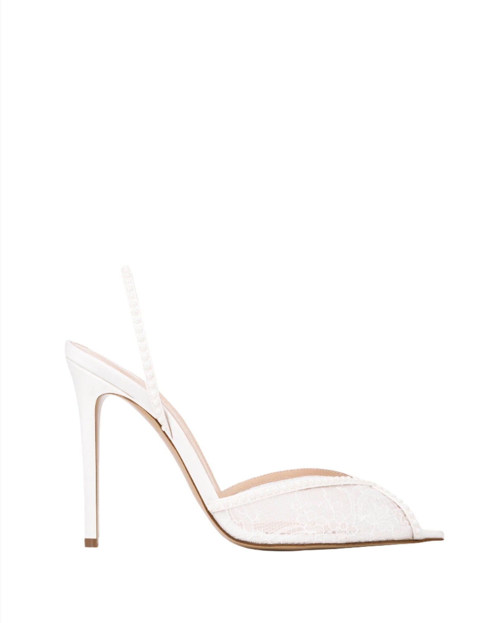 The KATY SLING LACE PEARL style epitomizes elegance. Featuring an open toe and meticulously crafted with pleated hand-cut lace, a silky mesh surface, and handpicked Pearl cabochons, this shoe adds a touch of sophistication to your ensemble.