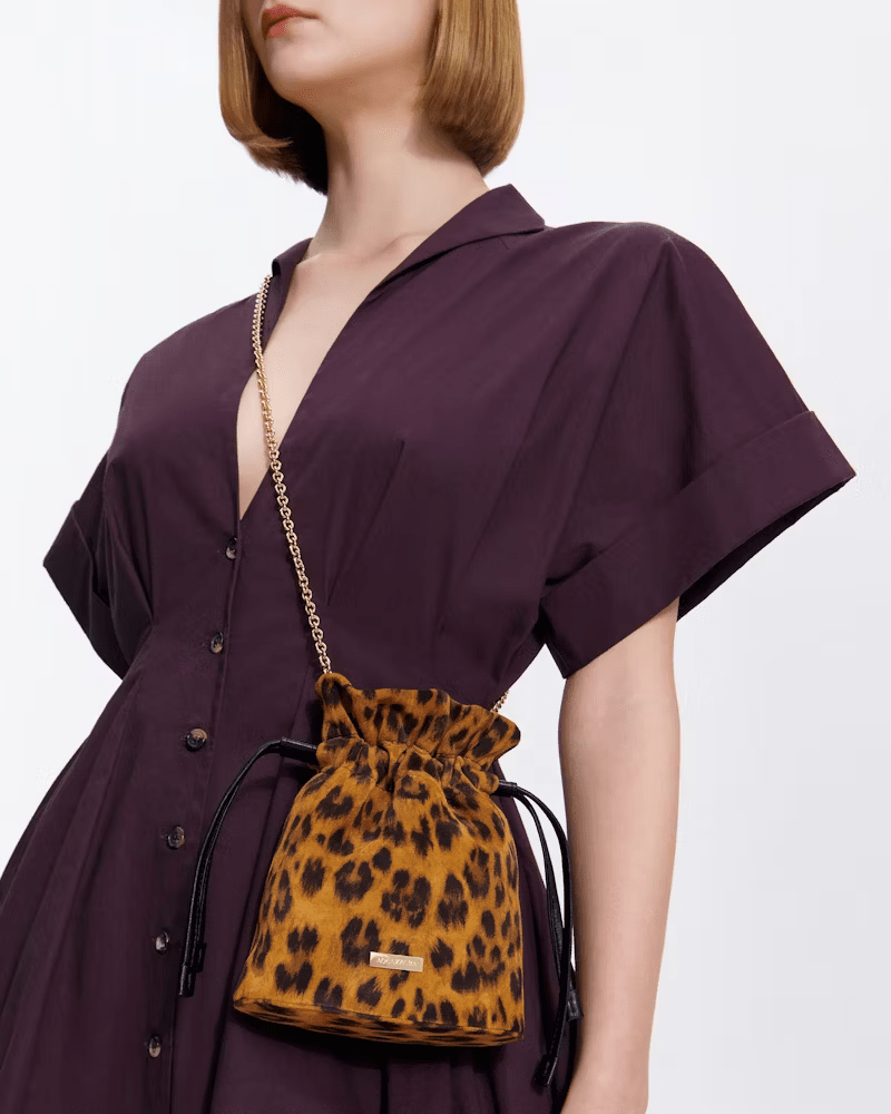 A timeless silhouette with easy appeal, the Christy Mini Pouch proves that petite bags are no longer confined to the party closet. Crafted from animal-printed suede, it has a soft shape that can be cinched using the drawstring ties. A grab-and-go style youll wear on repeat.