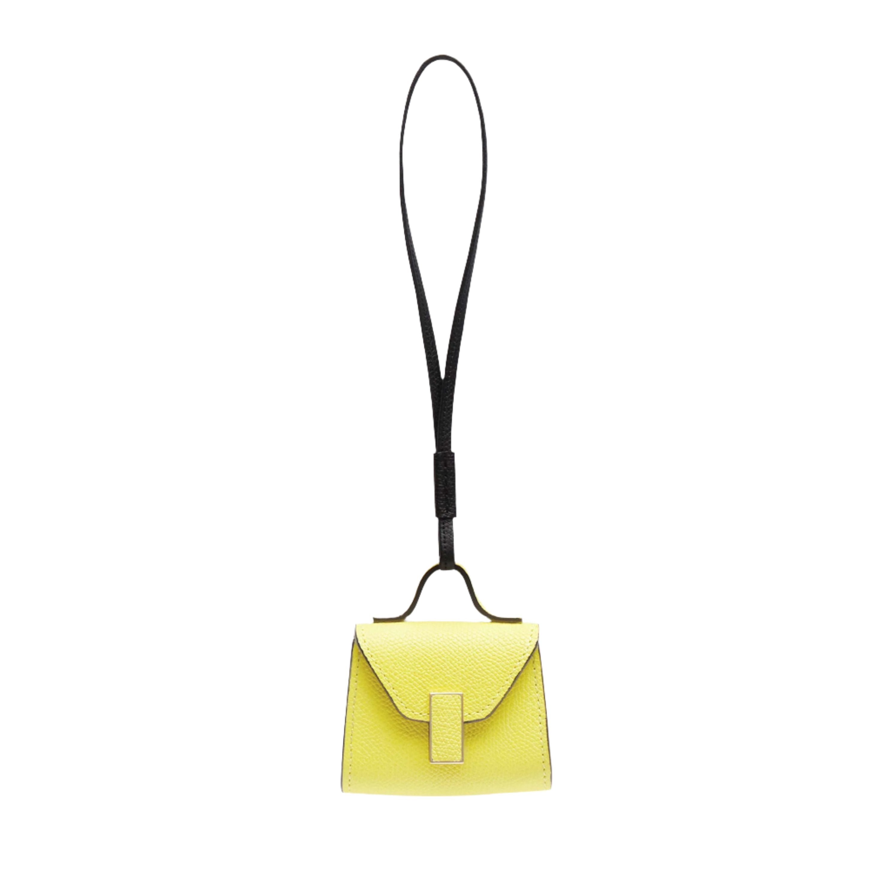 The Iside Charm reinvents our icon of urban craft as a whimsical accent piece. Easily attached to larger bags or worn around the neck with its lanyard, it has been crafted from our multidimensional Millepunte calf skin in citrine. Inside, there is a small compartment for a pair of airpods or other palm-sized valuables.