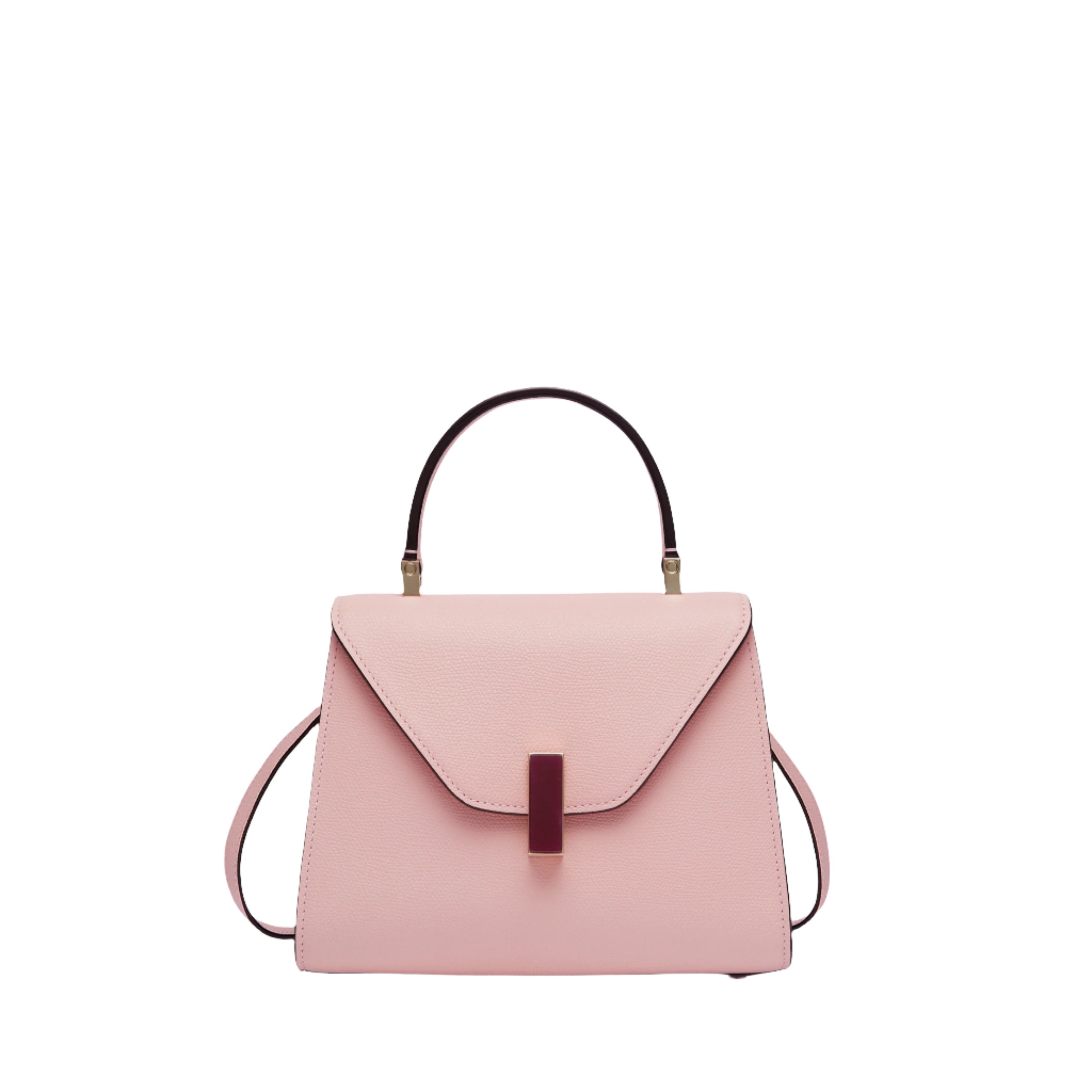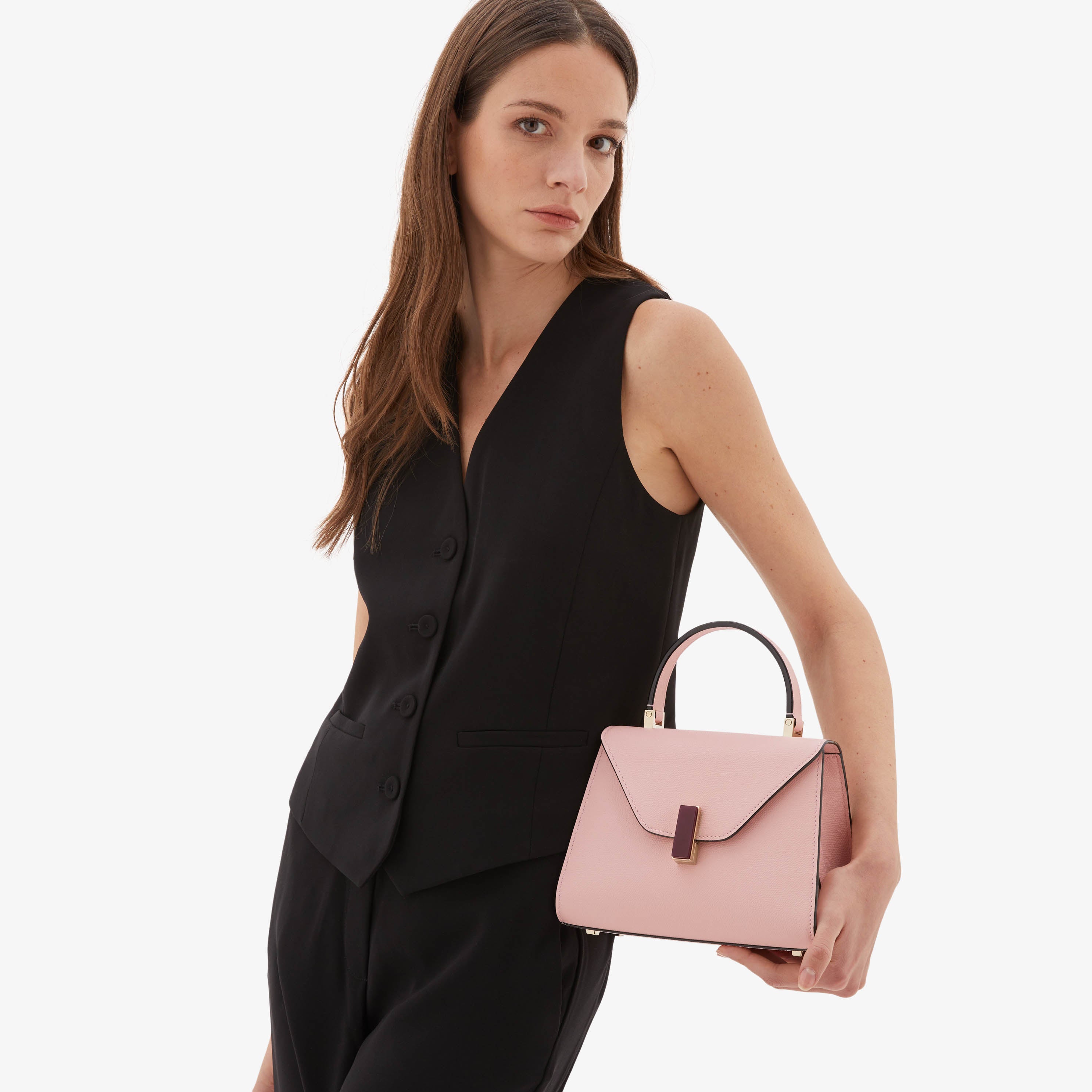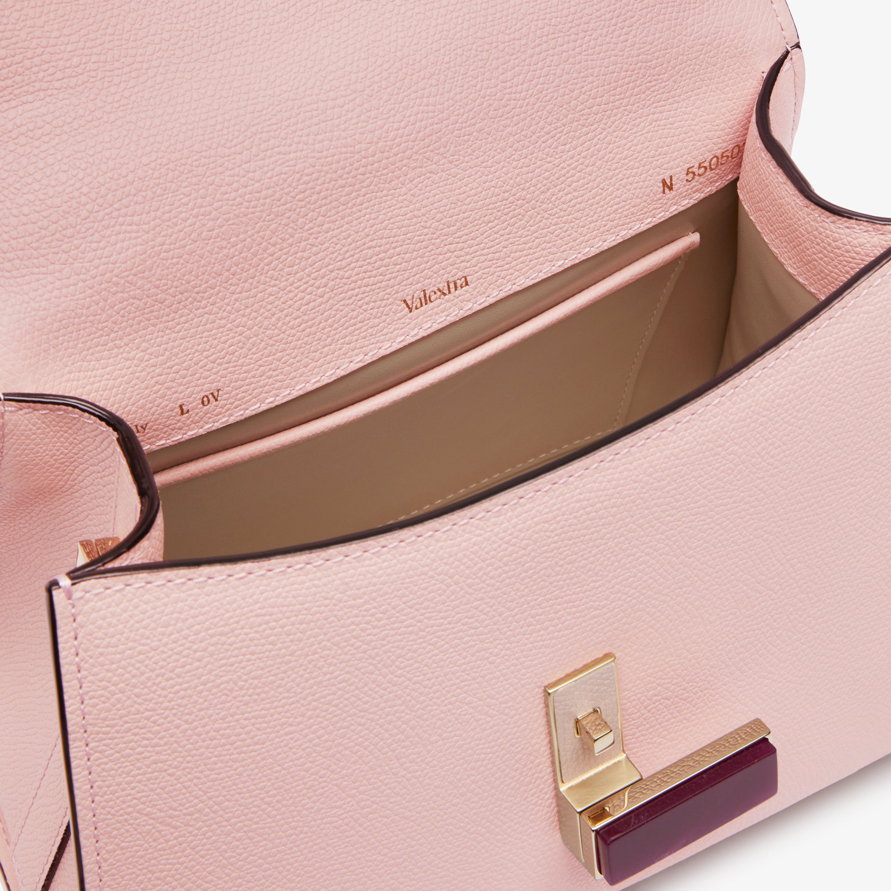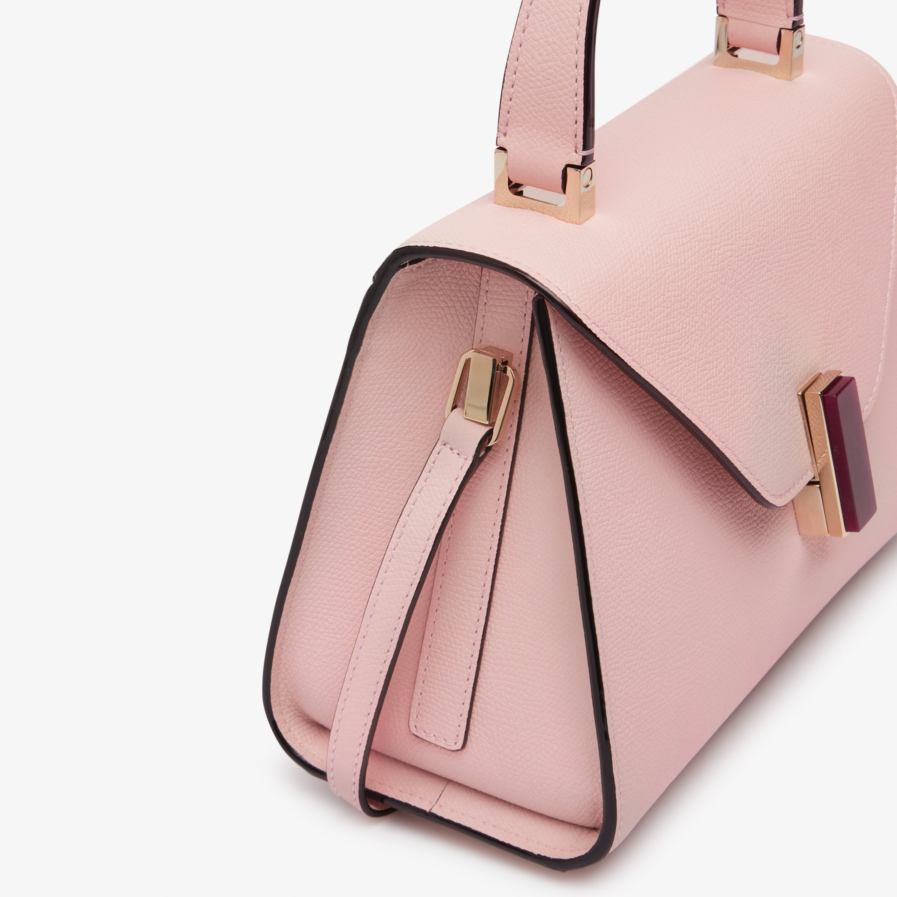 Fusing Milan’s famous sobriety and spontaneity, the Iside Quartz handbag imbues an inimitable spirit to evening and occasionwear. Enhanced with a ruby quartz twist-lock closure. our iconic top handle bag has been rendered in peony pink Millepunte calf skin that has newfound multidimensionality due to the juxtaposing textures. A matching shoulder strap that can be adjusted and detached to complement the comfortable top handle allows it to be worn on the shoulder and across the body. Finessed with our handpainted black lacquered Costa edging, it is at once distinctively Valextra and sophisticated object of beauty in its own right.