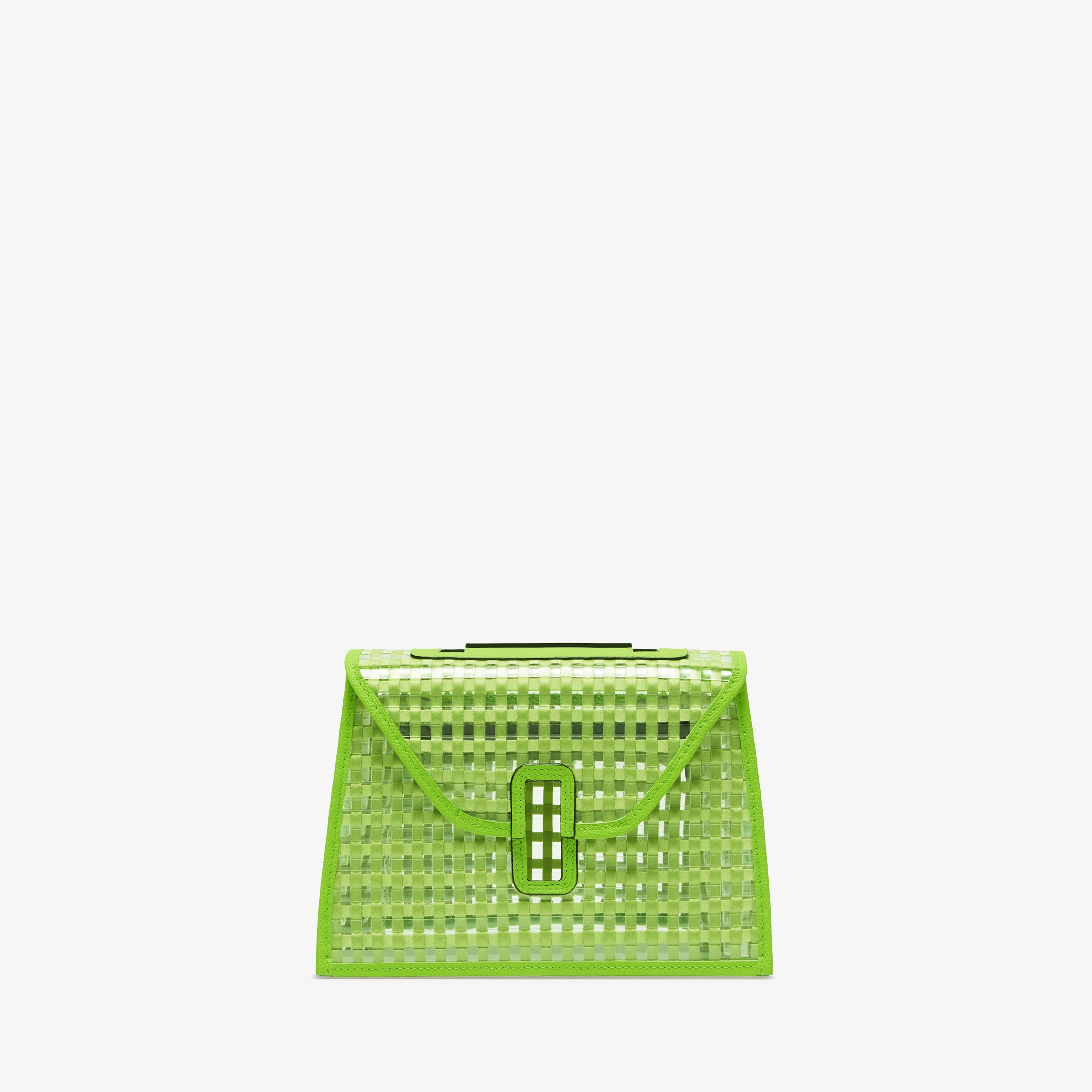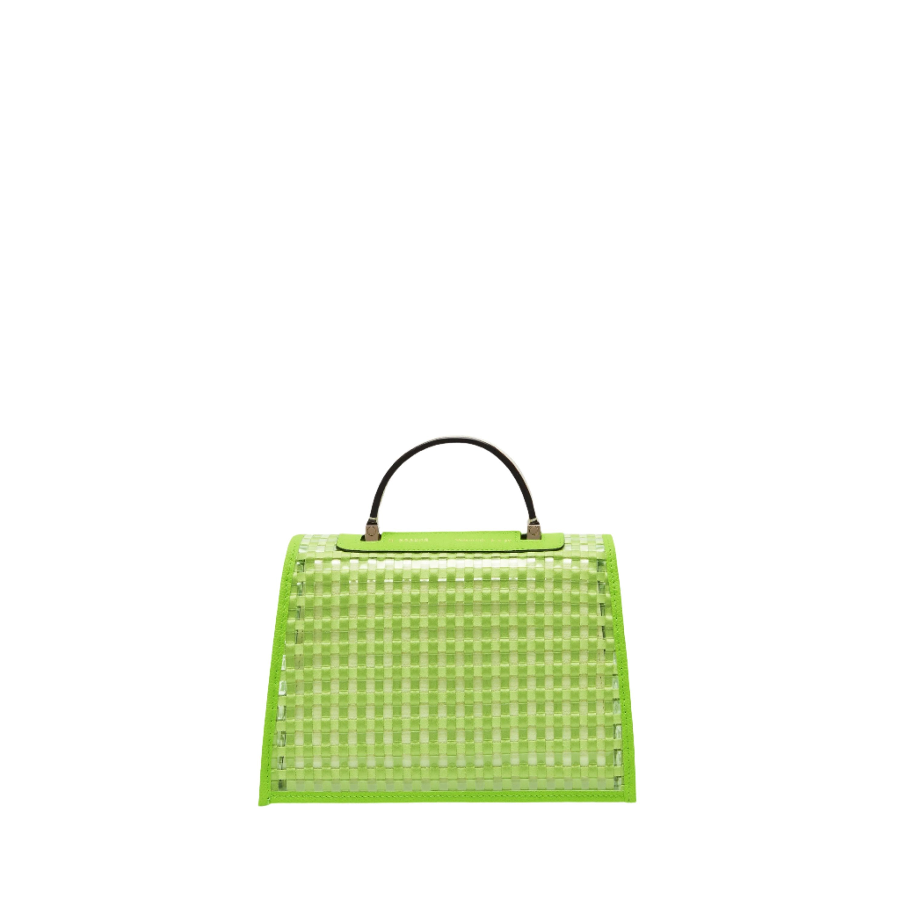 A striking top-handle raincoat crafted from recyclable PVC with hand-applied satin ribbon in apple green.