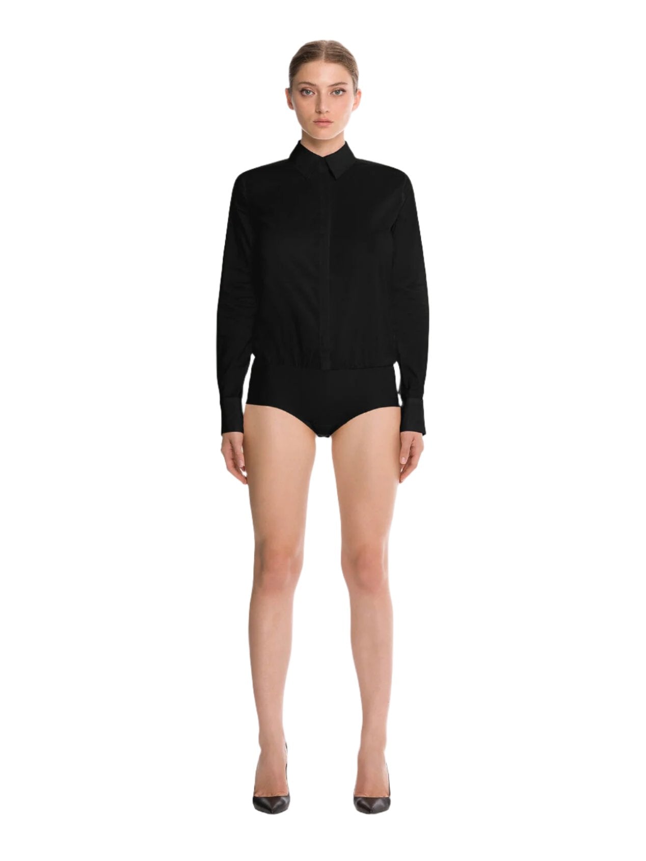 The classic white blouse is combined with an integrated bodysuit to create a real must-have item. The concealed button strip, oversized sleeves and wide cuffs guarantee a stylish look.