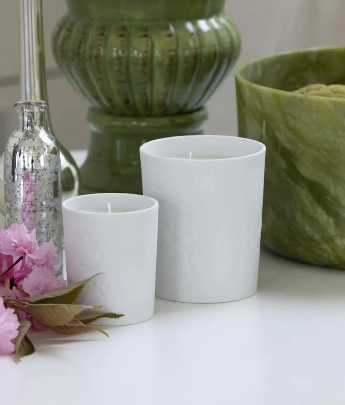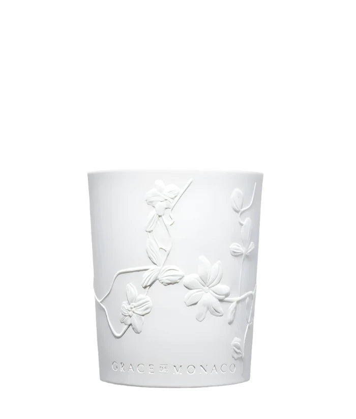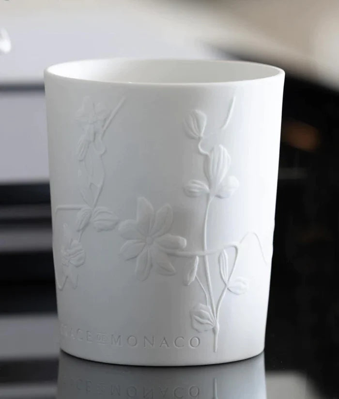 Grace de Monaco ceramic candles feature sculpted floral relief inspired by the pressed flower designs of Princess Grace of Monaco. Danse Étoilée is luminous with top notes of sparkling citrus, rhubarb, cassis and a bright bouquet of flowers. Fragrance by Olivier Cresp and vessel designed by Jérôme Faillant-Dumas.