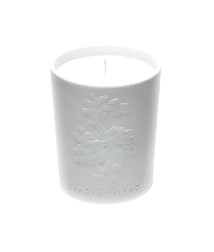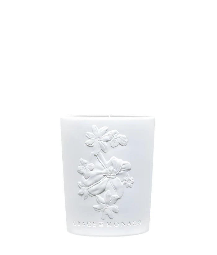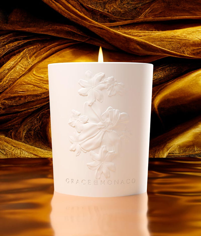 Grace de Monaco ceramic candles feature sculpted floral relief inspired by the pressed flower designs of Princess Grace of Monaco. Danse Étoilée is luminous with top notes of sparkling citrus, rhubarb, cassis and a bright bouquet of flowers. Fragrance by Olivier Cresp and vessel designed by Jérôme Faillant-Dumas.