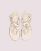 Judy sandal with ankle strap and toe post in soft beige leather featuring large handmade leather flower detail, rubber sole and leather insole.