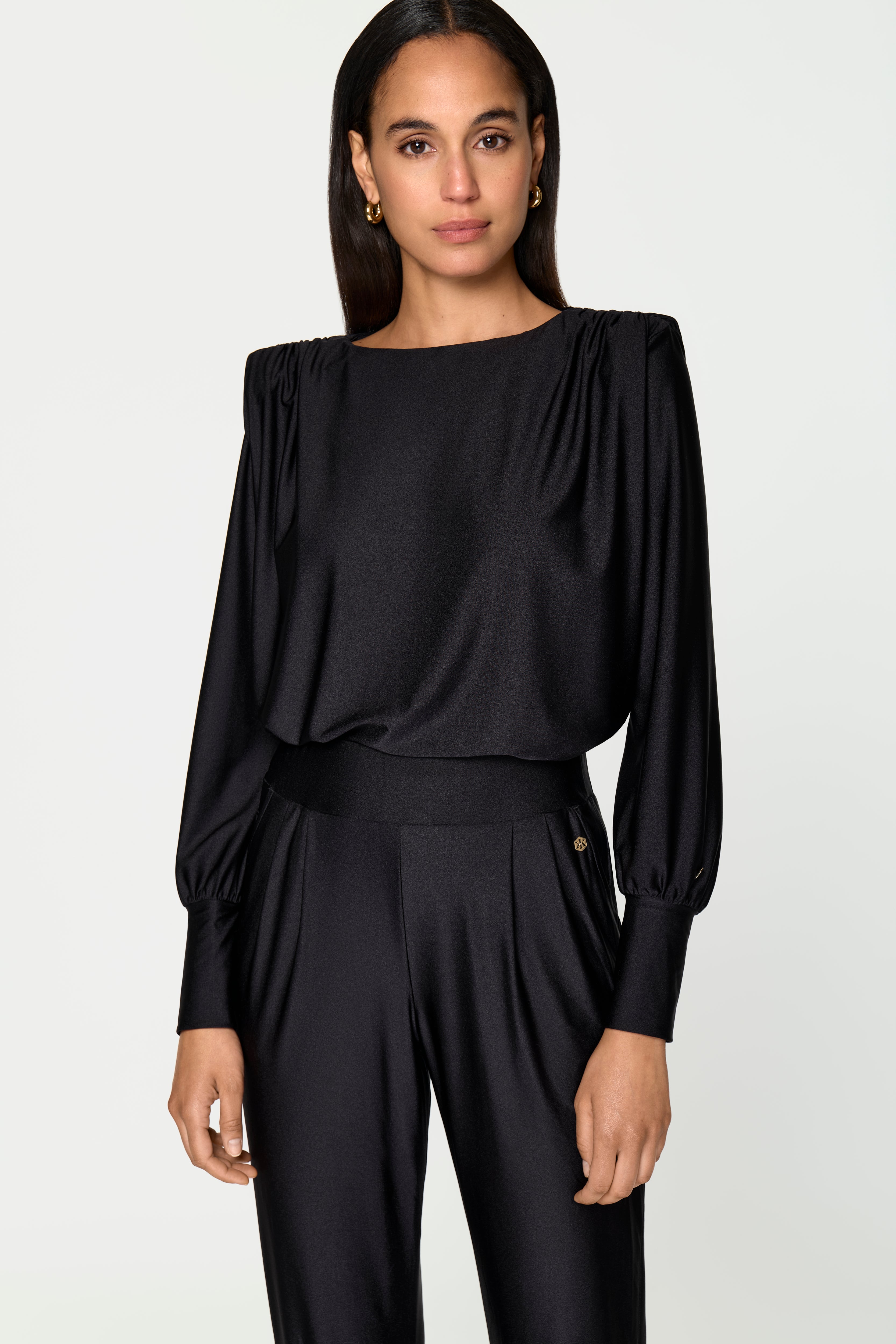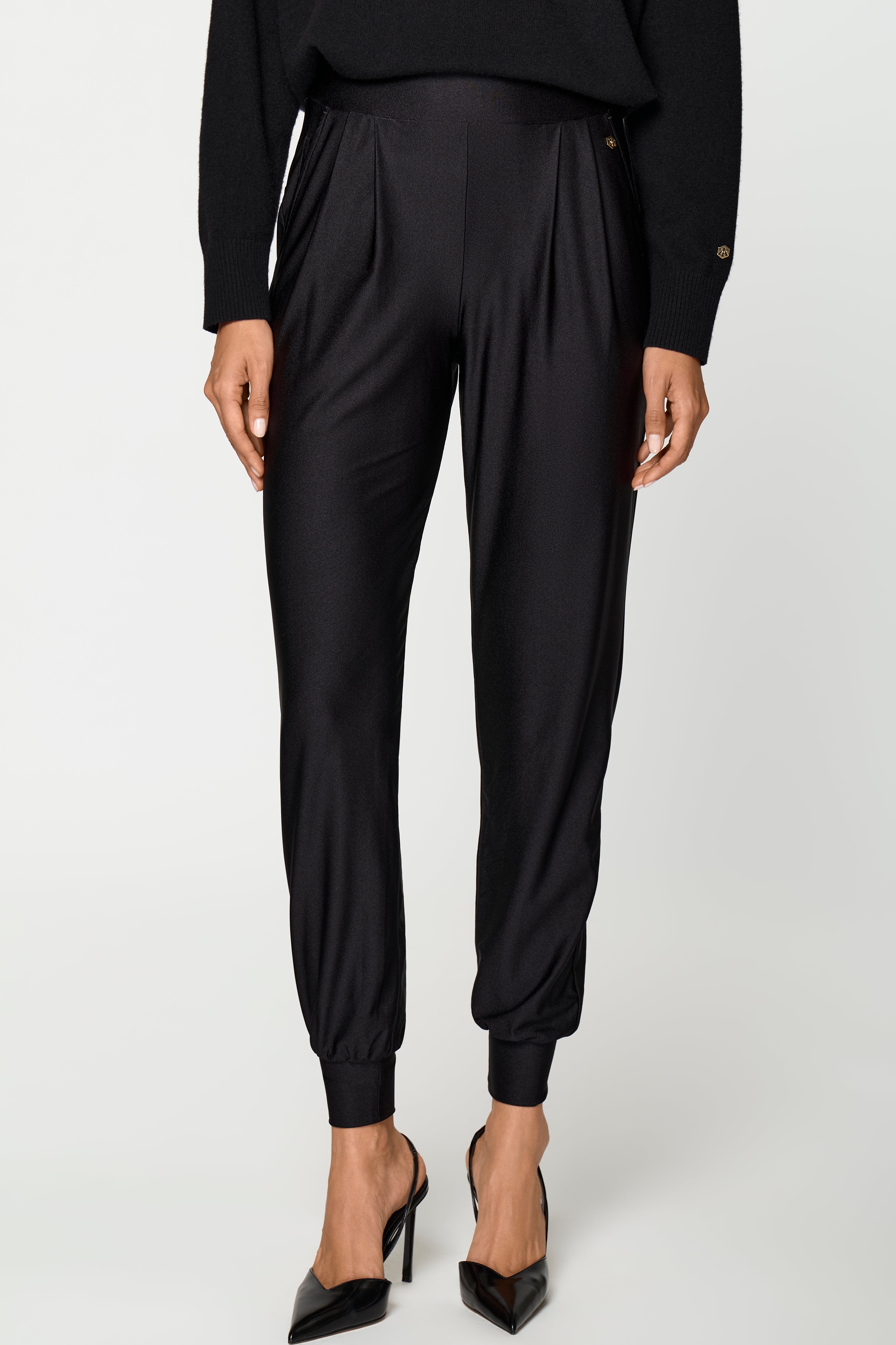 The AURA Stretch Pants in black are made from highly elastic functional material, providing lasting comfort with a soft, elastic waistband, and 4-way stretch. The cut represents the elegant version of the LUXE LÉGER Track Pants, featuring a shimmering fabric that feels incredibly soft on the skin. Combine these pants with the matching PECUNIA Blouse for a festive jumpsuit look.