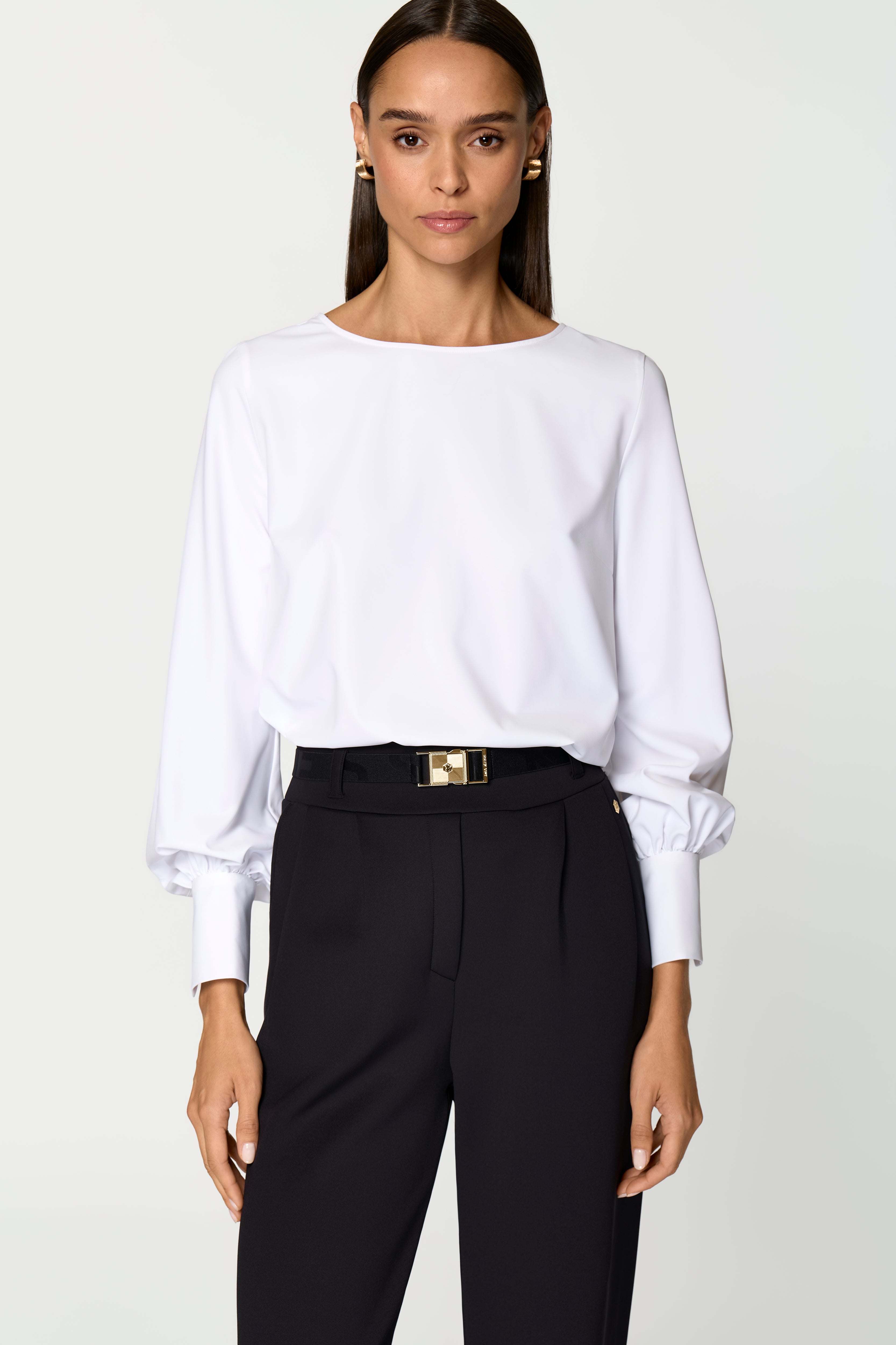 The CHERUBIN Blouse features a gorgeous boat neckline and beautiful sleeves with elasticated cuffs. It is non-iron, and the material is opaque.