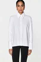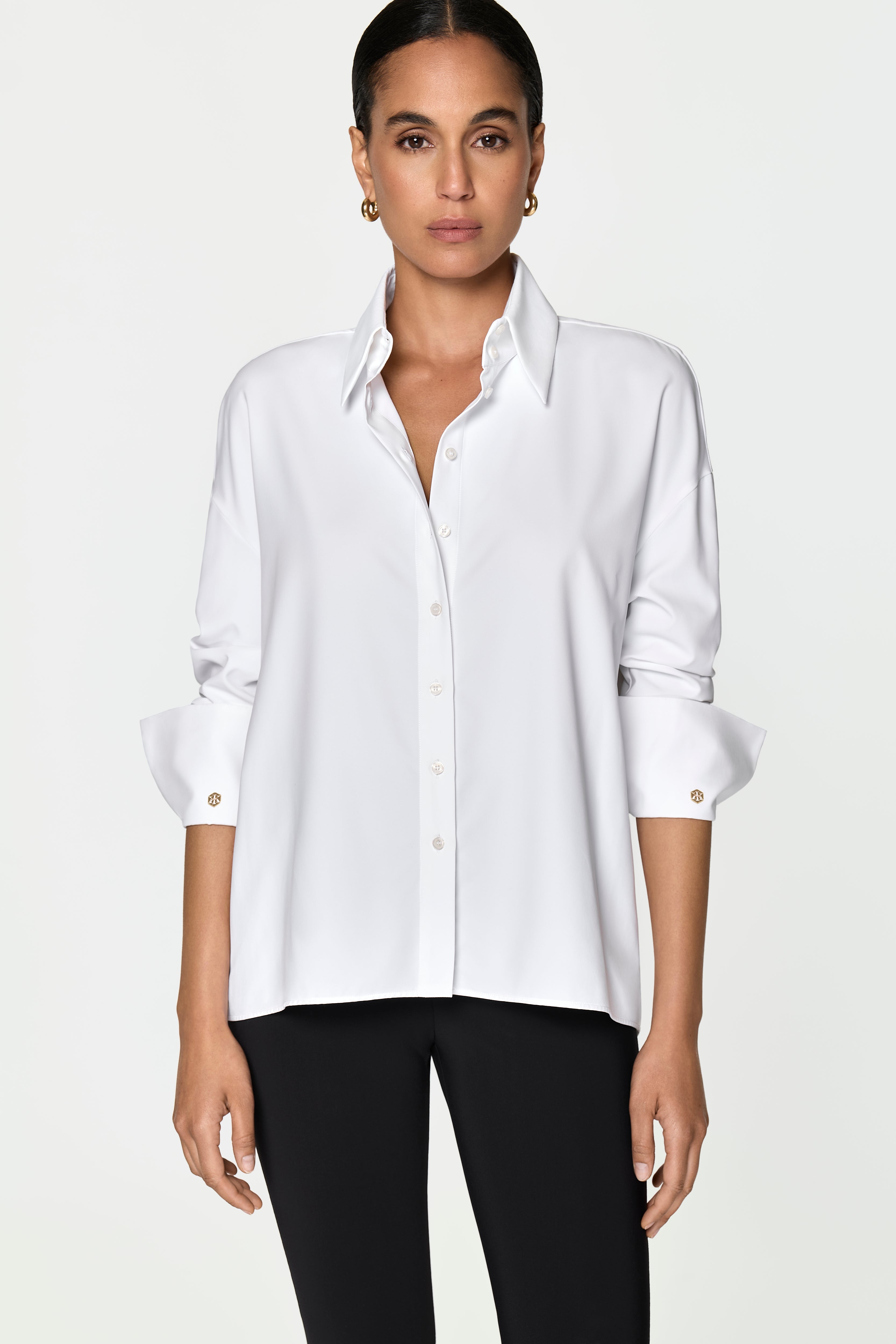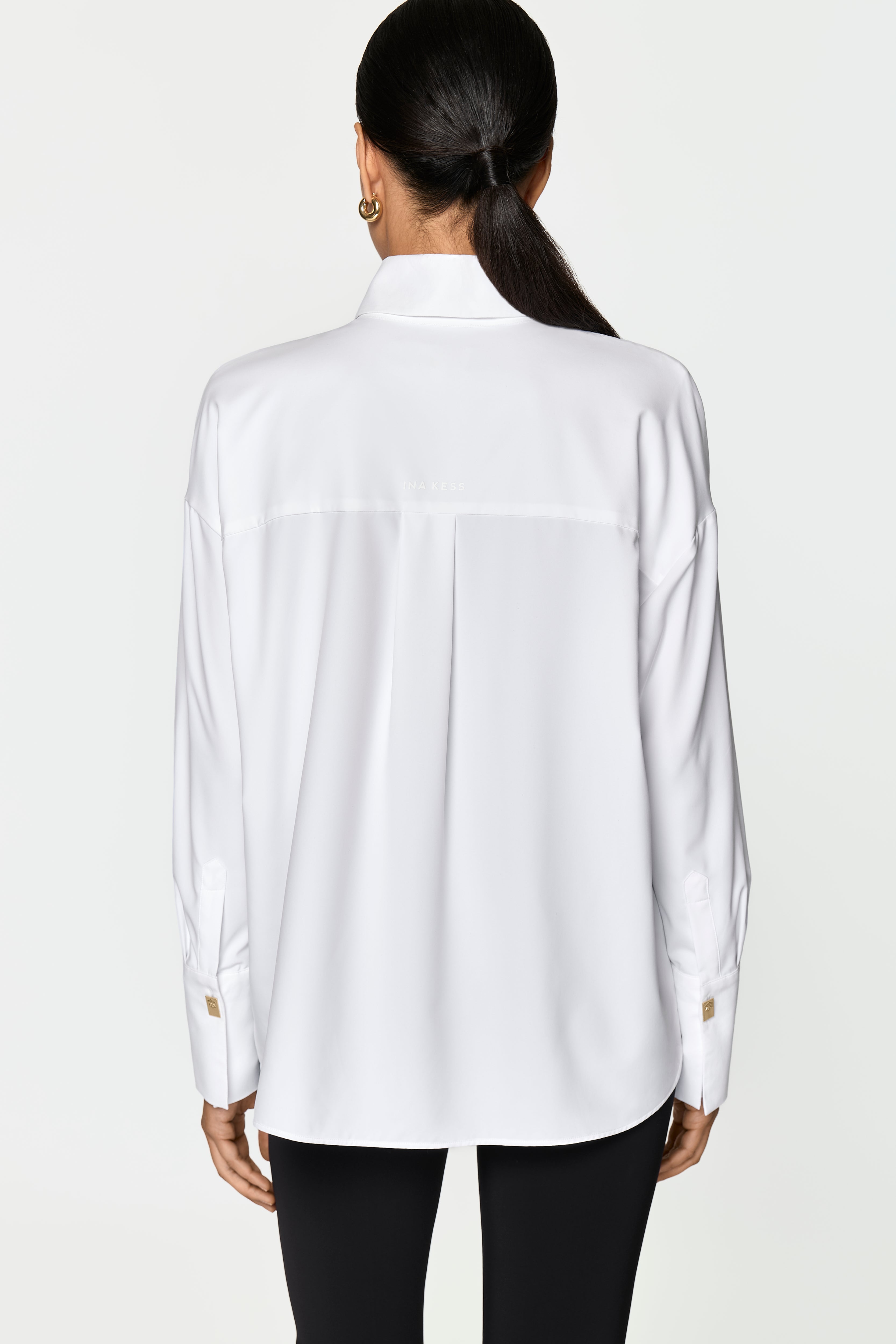 The LAREGIA Shirt combines sharp tailoring with effortless stretch. Featuring defined shoulder pads and integrated elastics at the sleeves, it offers supreme comfort and structure. Wear it buttoned up for a sleek, polished look or open for relaxed elegance. Finished with the signature white INA KESS logo print on the back for a subtle statement.