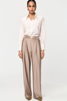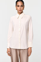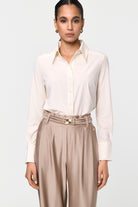 This fitted shirt is made from exceptionally soft, opaque fabric that is non-iron and features lovely golden buttons, adding a sophisticated touch to its practical design.