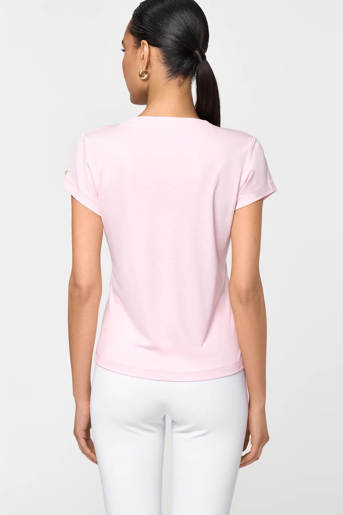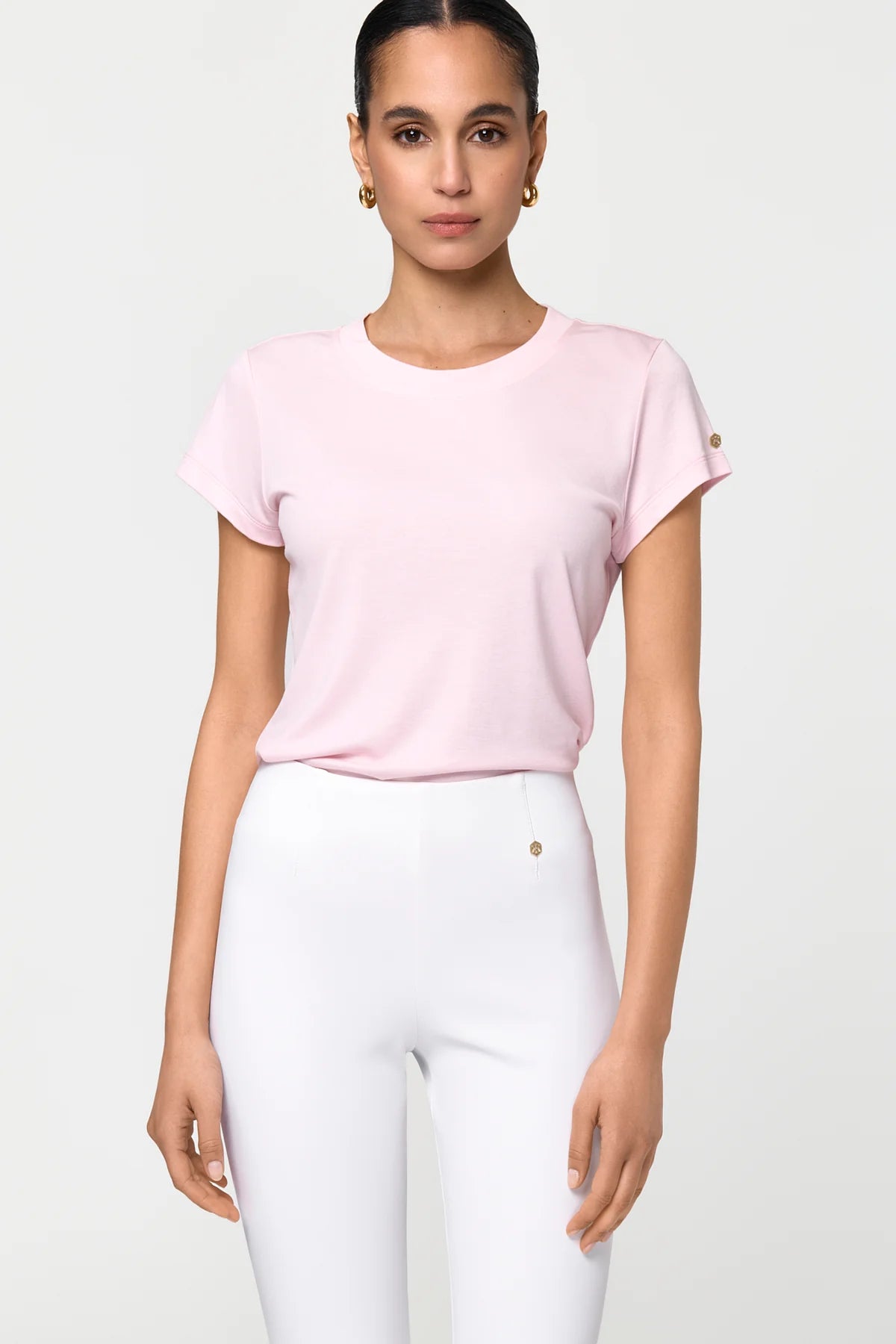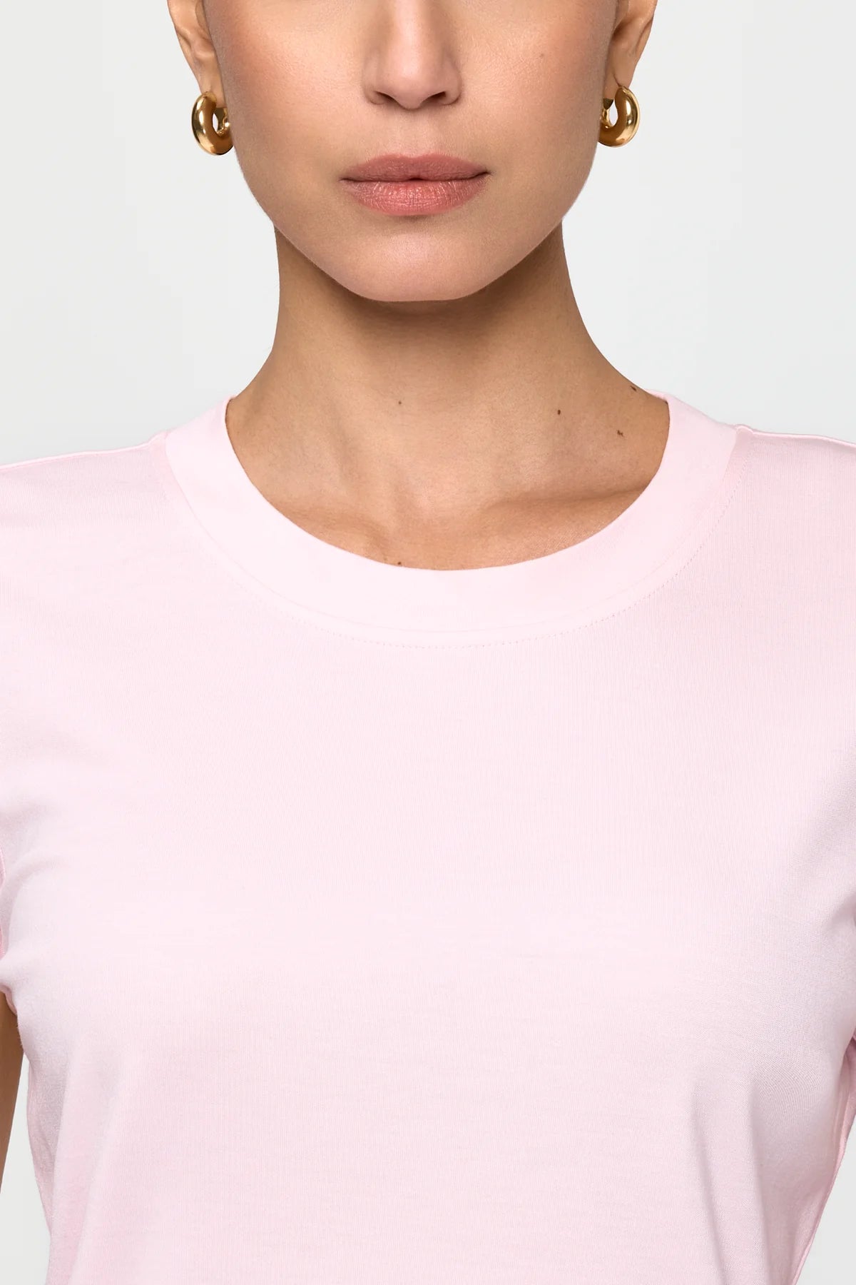 This loose fit t-shirt features a refined neckband in self-fabric and cropped sleeves, crafted from breathable and cooling Tencel fabric for superior comfort in warm weather.