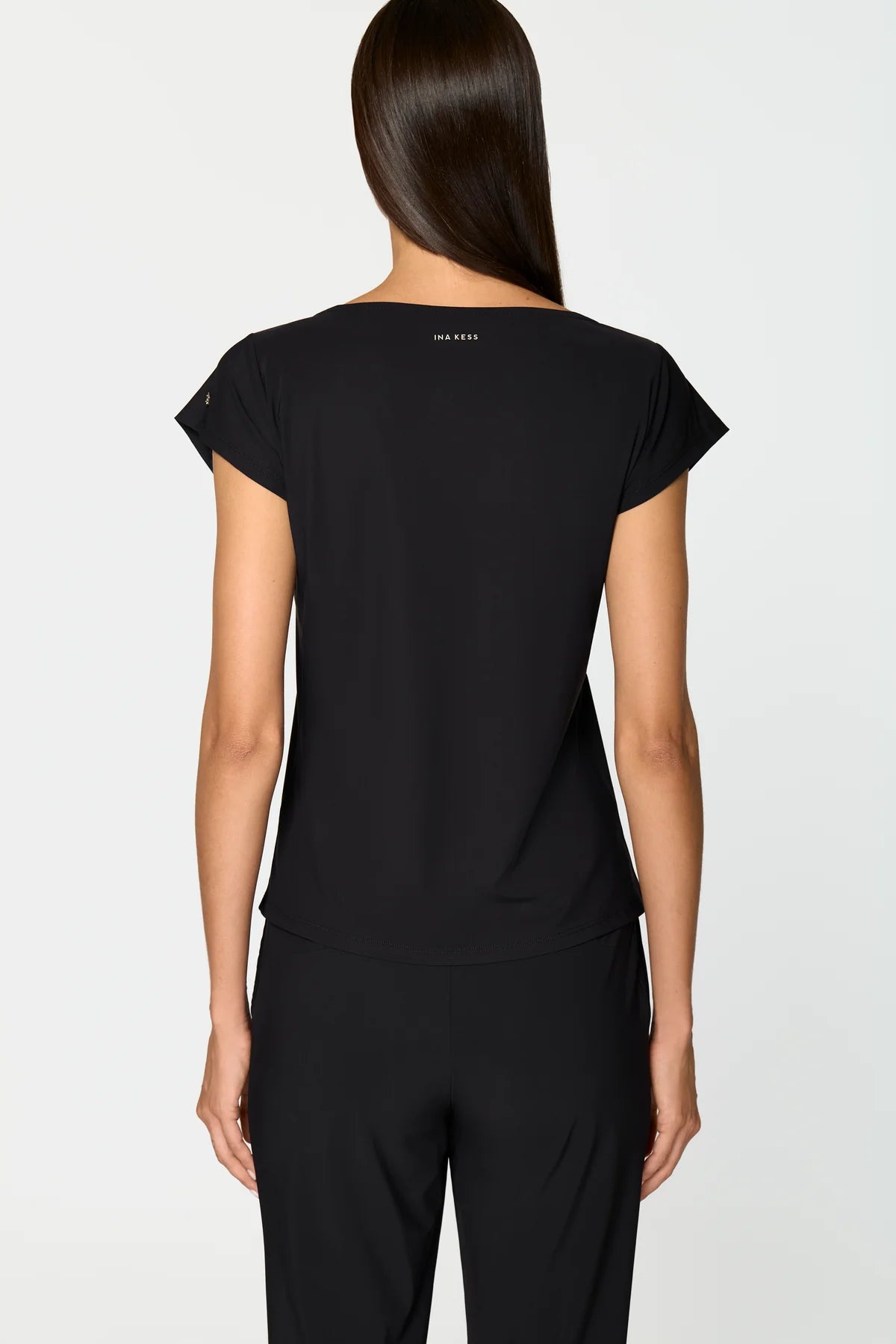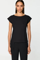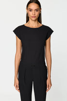 This relaxed fit t-shirt features a boat neckline and extra capped sleeves and is made from a lightweight, stretchy, and breathable fabric that is quick drying and retains its solid black colour even after multiple washings, making it ideal for travel.