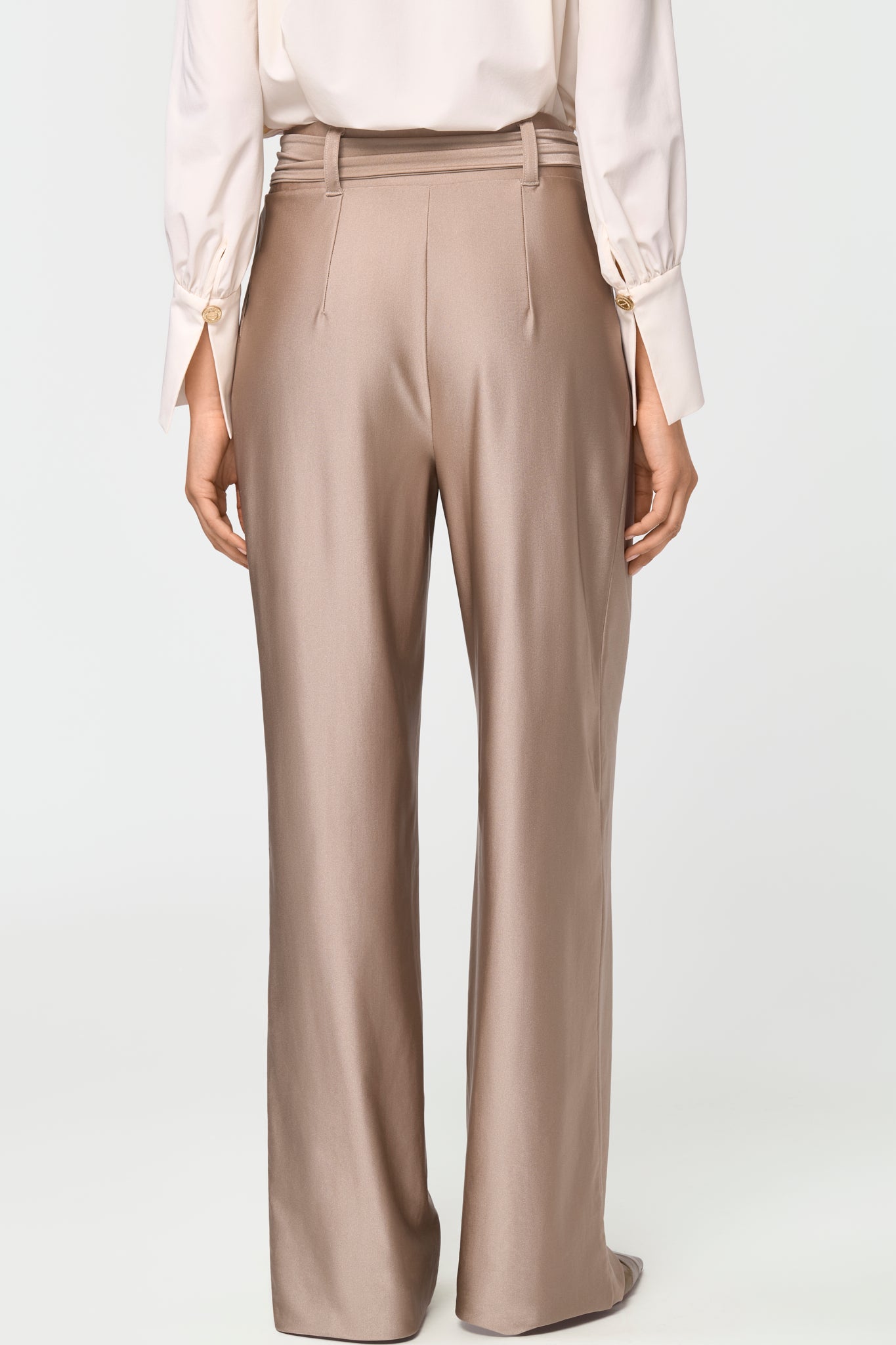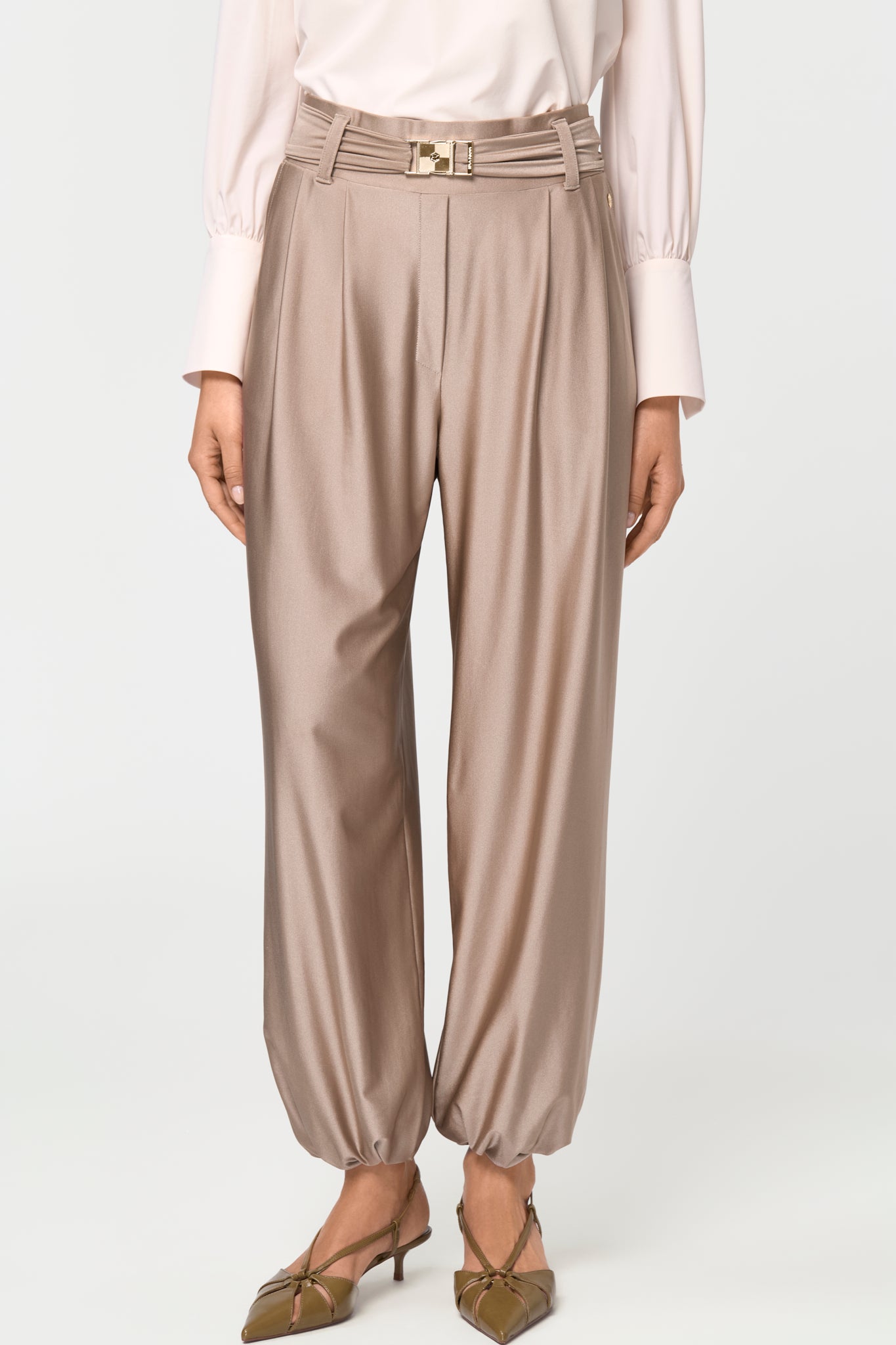 These wide-leg pants feature a fitted waistband, side pockets, an elasticated belt with a golden buckle, and an elastic at the ends for versatile styling, all in a stretchy, breathable, quick-dry, shiny fabric.