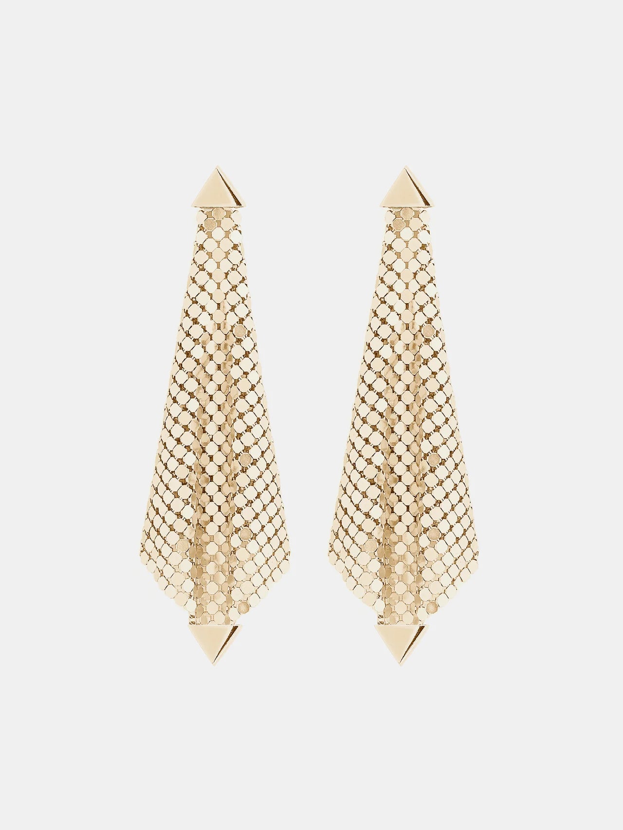 The square earrings design is faithful to the craftsmanship and iconic materials of the Maison Rabanne. Earrings are made from gold mesh forming a diamond shape that falls into an elegant drape. Drop earrings in a soft, flexible and light material, a nod to the DNA of our Maison.