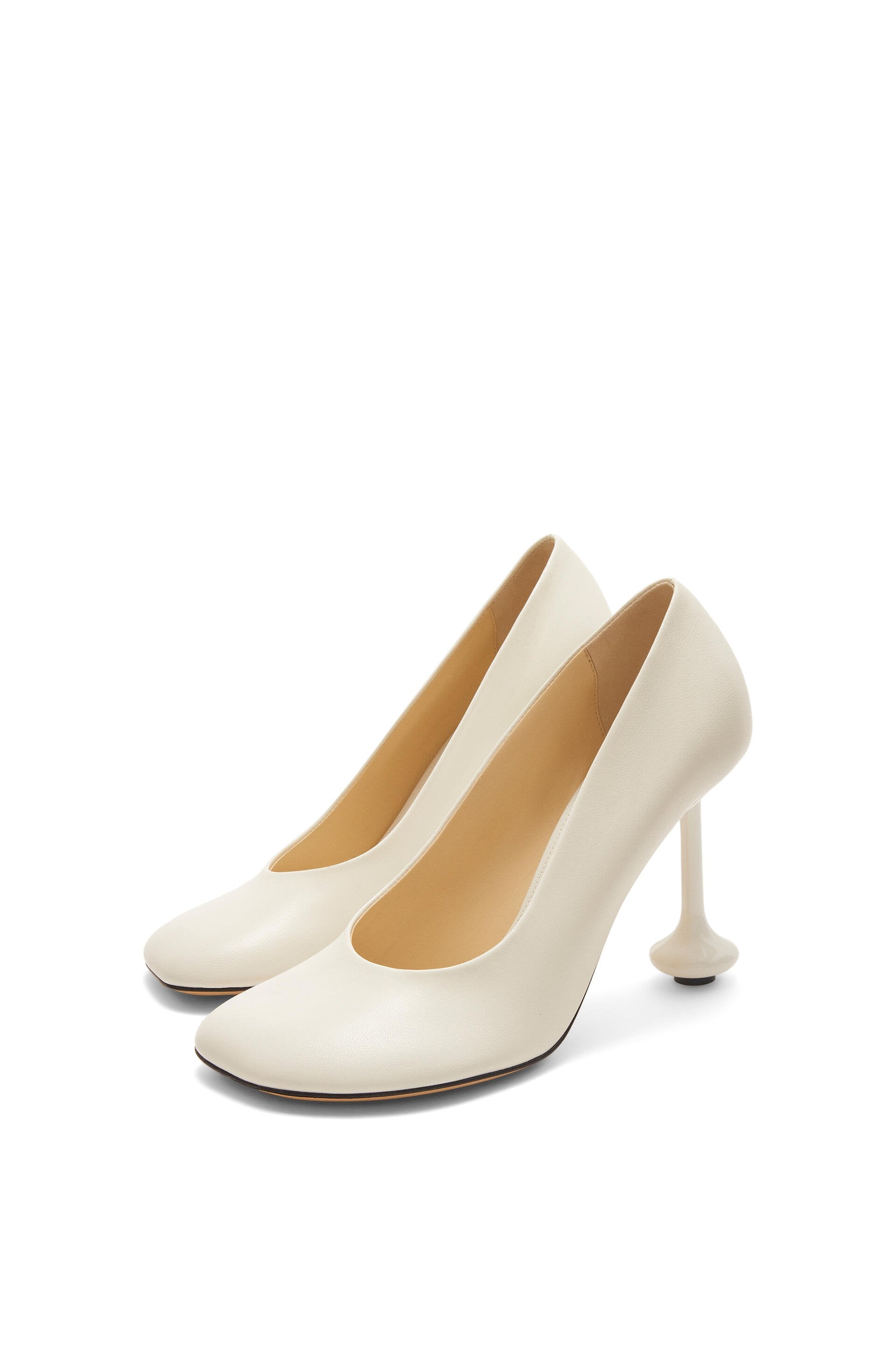 Second skin pumps in goatskin with a petal shaped toe and lacquered toy heel. The SS23 shoe collection plays on tension and contrast: handcraft clashes with a fetish attitude and natural materials collide with the technical. Key details include playful heels, graphic logos and asymmetric toes and straps