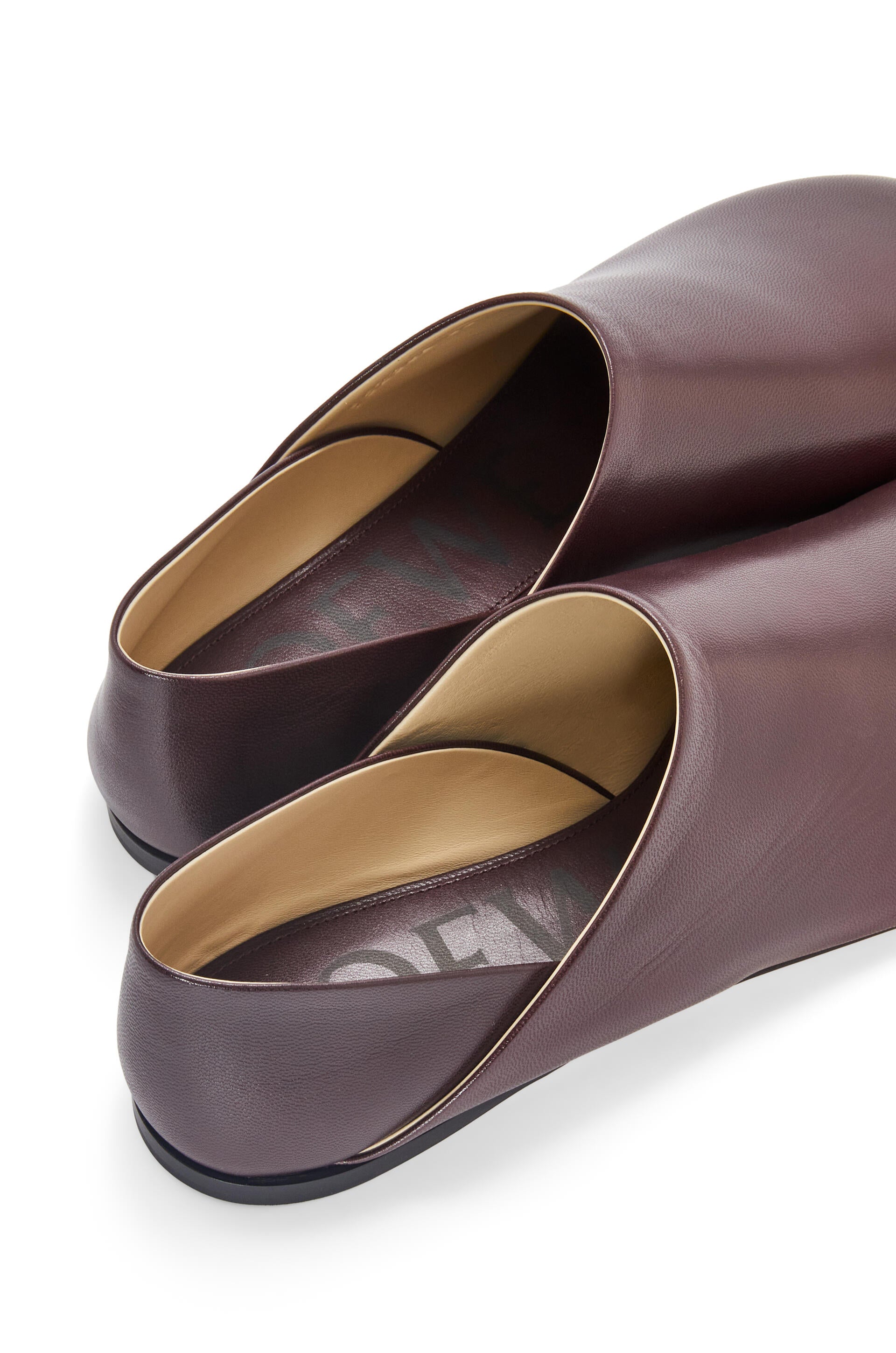 Second skin slippers in goatskin with a petal shaped toe. The SS23 shoe collection plays on tension and contrast: handcraft clashes with a fetish attitude and natural materials collide with the technical. Key details include playful heels, graphic logos and asymmetric toes and straps.