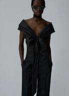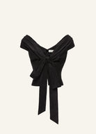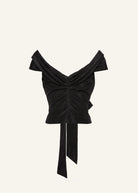 A romantic silk blouse with a plunging neckline and off-the-shoulder silhouette. Designed with long sashes that wrap and tie at the front. Fastens at the center back with a zipper.
