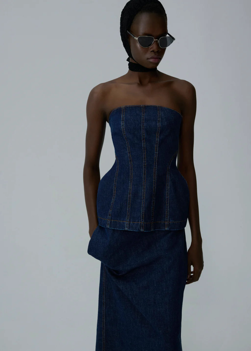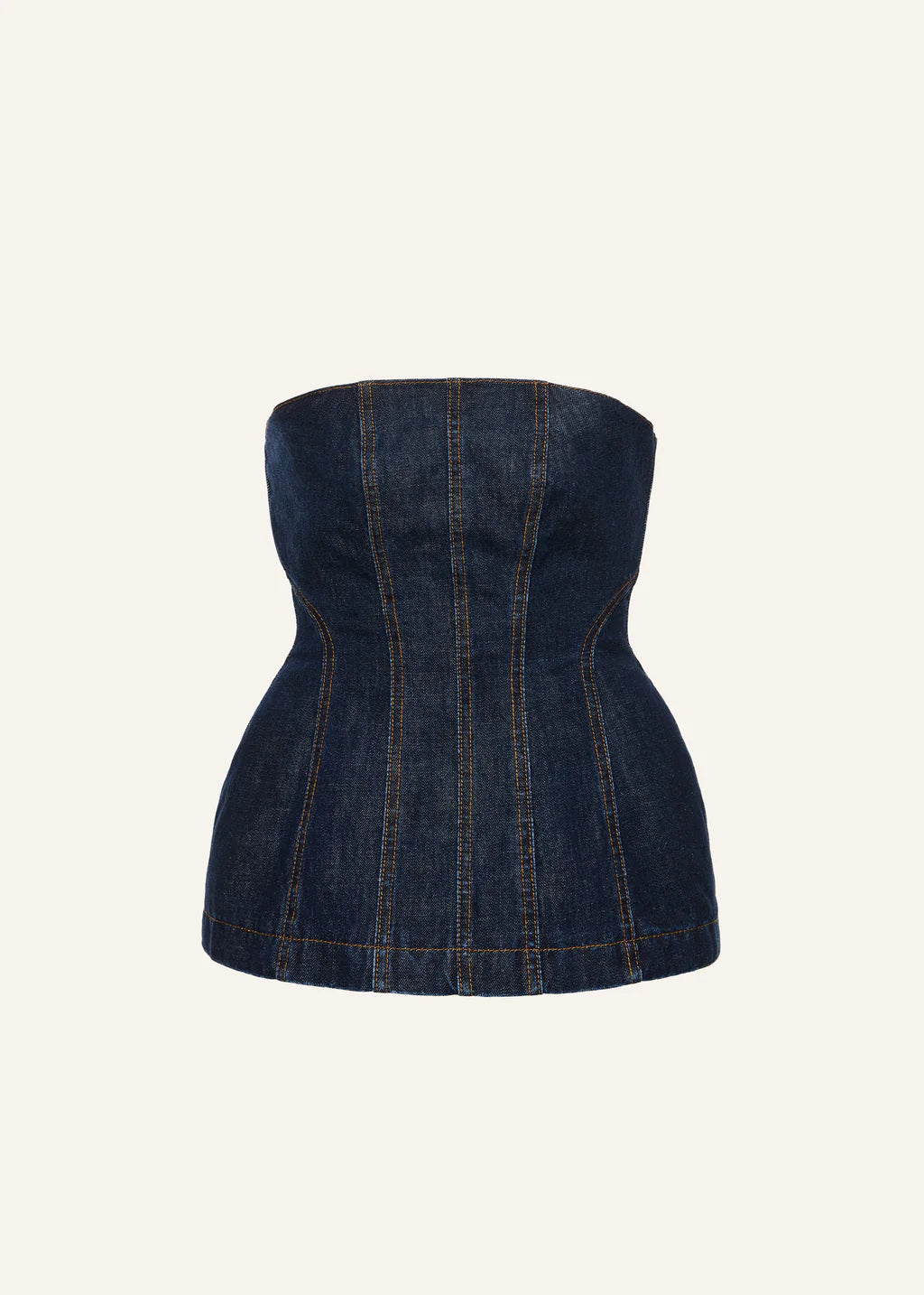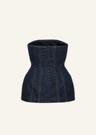 This sculpted corset top is crafted from rigid cotton denim, offering a structured and flattering silhouette. The strapless neckline and contoured panel construction enhance the hourglass shape, while contrast topstitching accentuates the architectural lines.