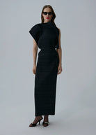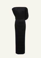 A narrow, ankle-length dress with sculptural silhouette. The design features a dramatic asymmetrical structure at the bodice with a wide, elevated neckline and open back down to the waist. Deep pleats contour the front, creating dimensional shape, while the internal waistband is secured with lingerie-style closures for added support. The dress fastens with a concealed zip at center back, finishing with a slit below for ease of movement.