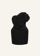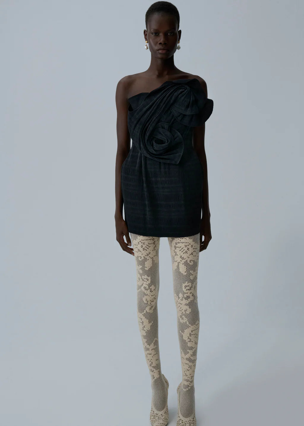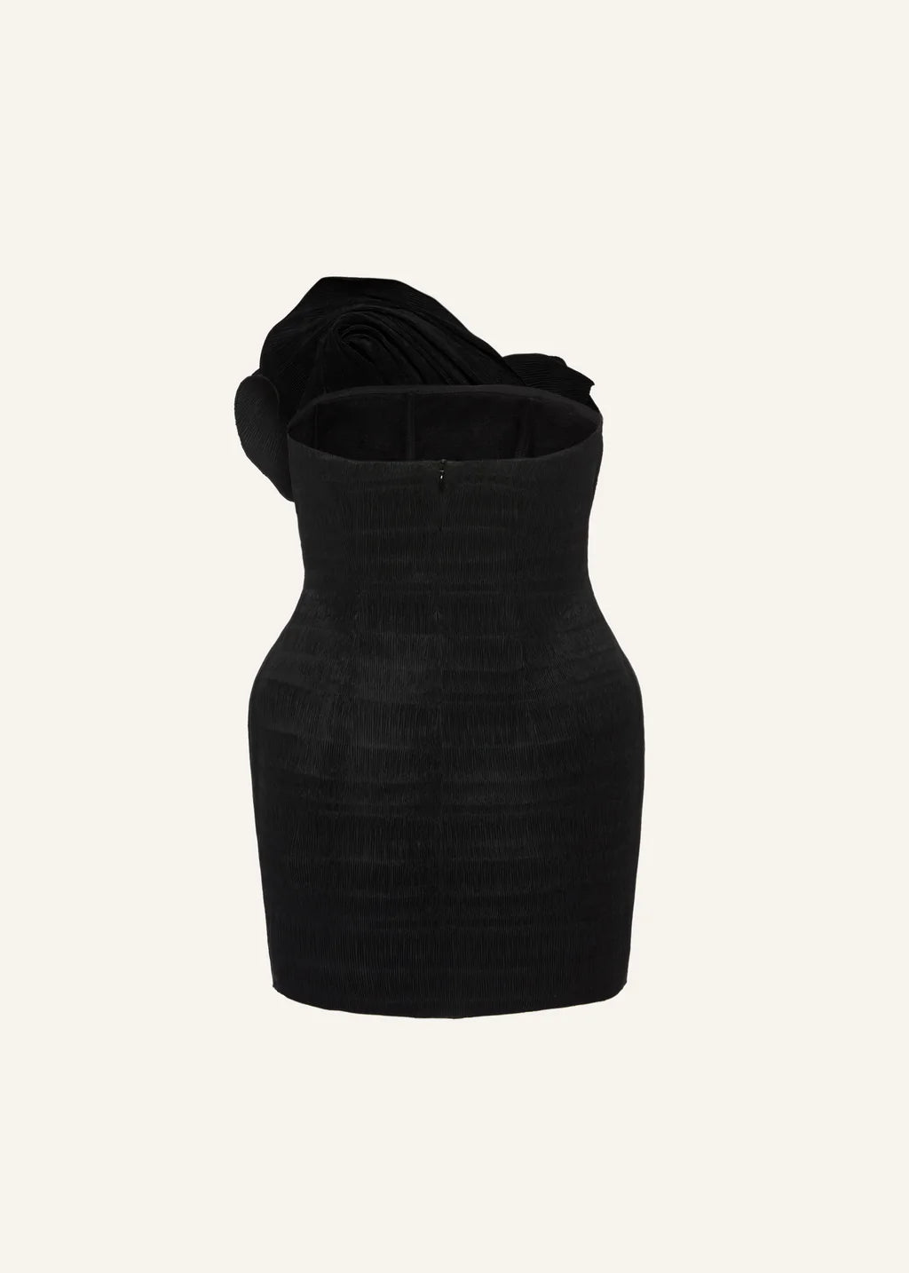 A striking mini dress with a sculptural silhouette. Crafted in textured fabric, the form-fitting cut is dominated by an elaborate, oversized rosette and swirl detail that wraps from the shoulder across the bodice. The piece blends structural precision with couture-inspired craftsmanship, creating a statement look perfect for evening occasions.
