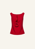 A sleeveless top featuring a wide, round neckline. The front is accented by a deep teardrop cut-out, finished with a sculptural flower along the edge. The design is completed with a concealed zip closure at the center back.