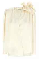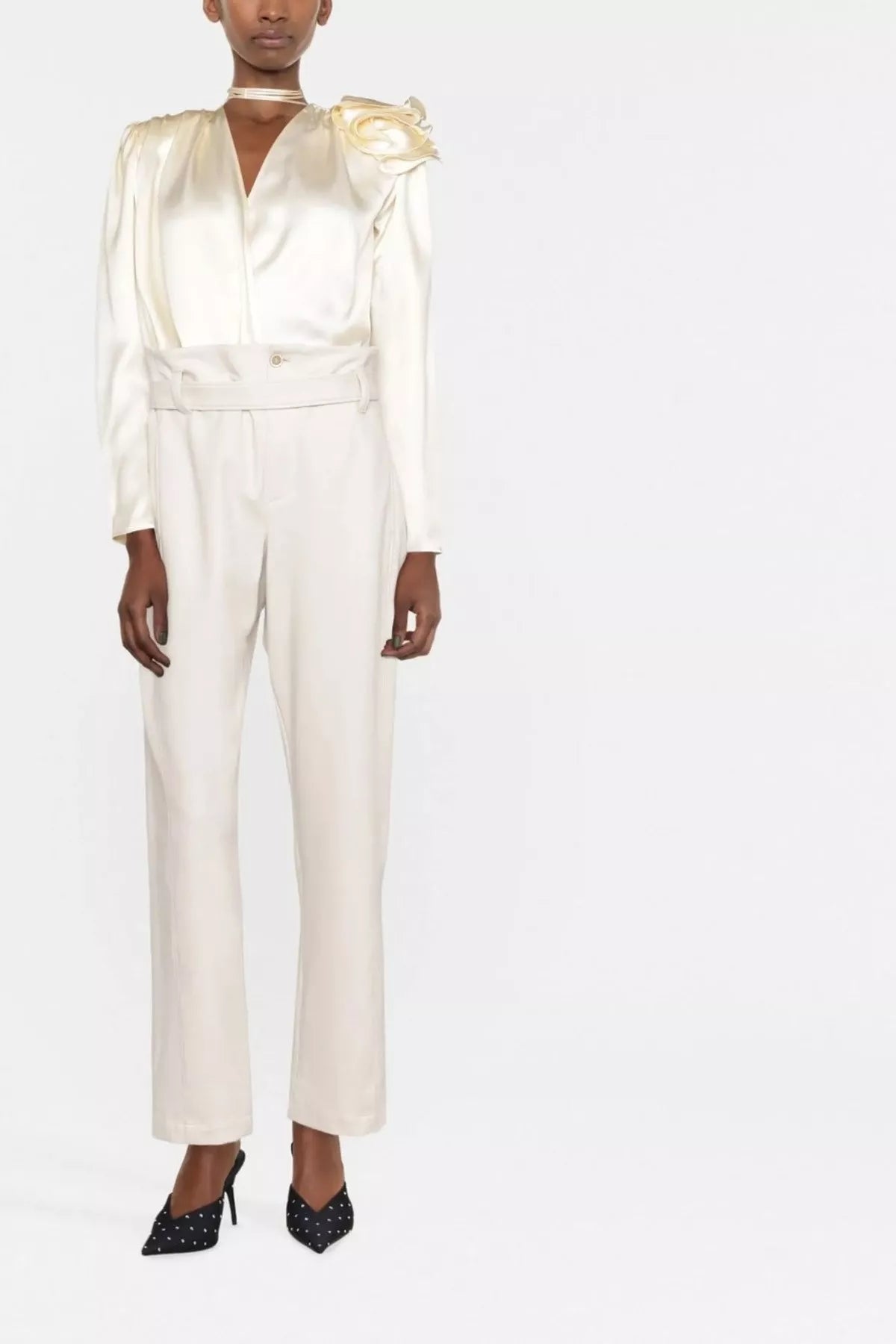 Magda Butrym's classic long-sleeve flower applique blouse with detachable shoulder pads and strappy tie detail at the neck.