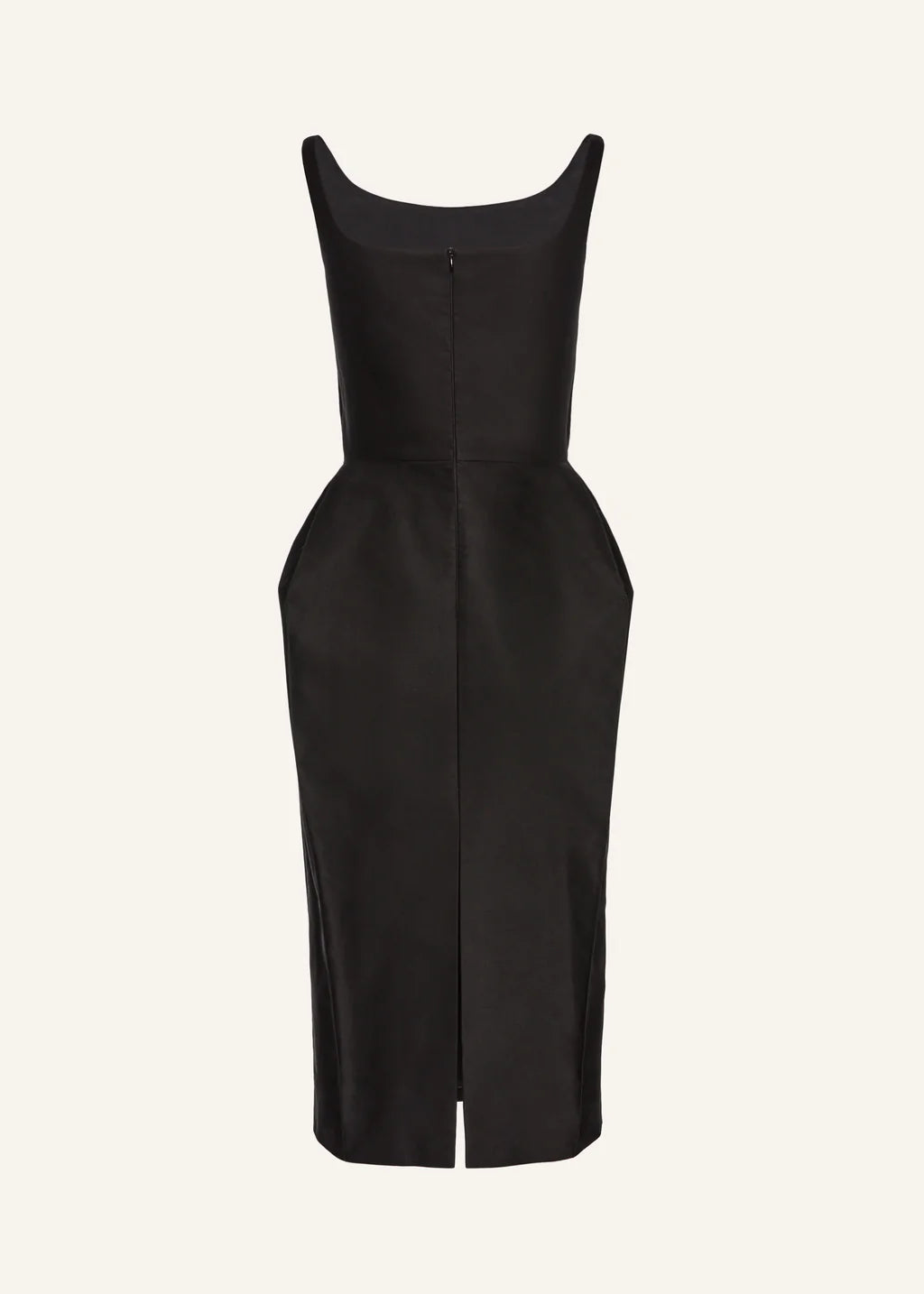 A cotton midi dress with an exaggerated hourglass shape created through hip pads, complete with a button up chest detailing.