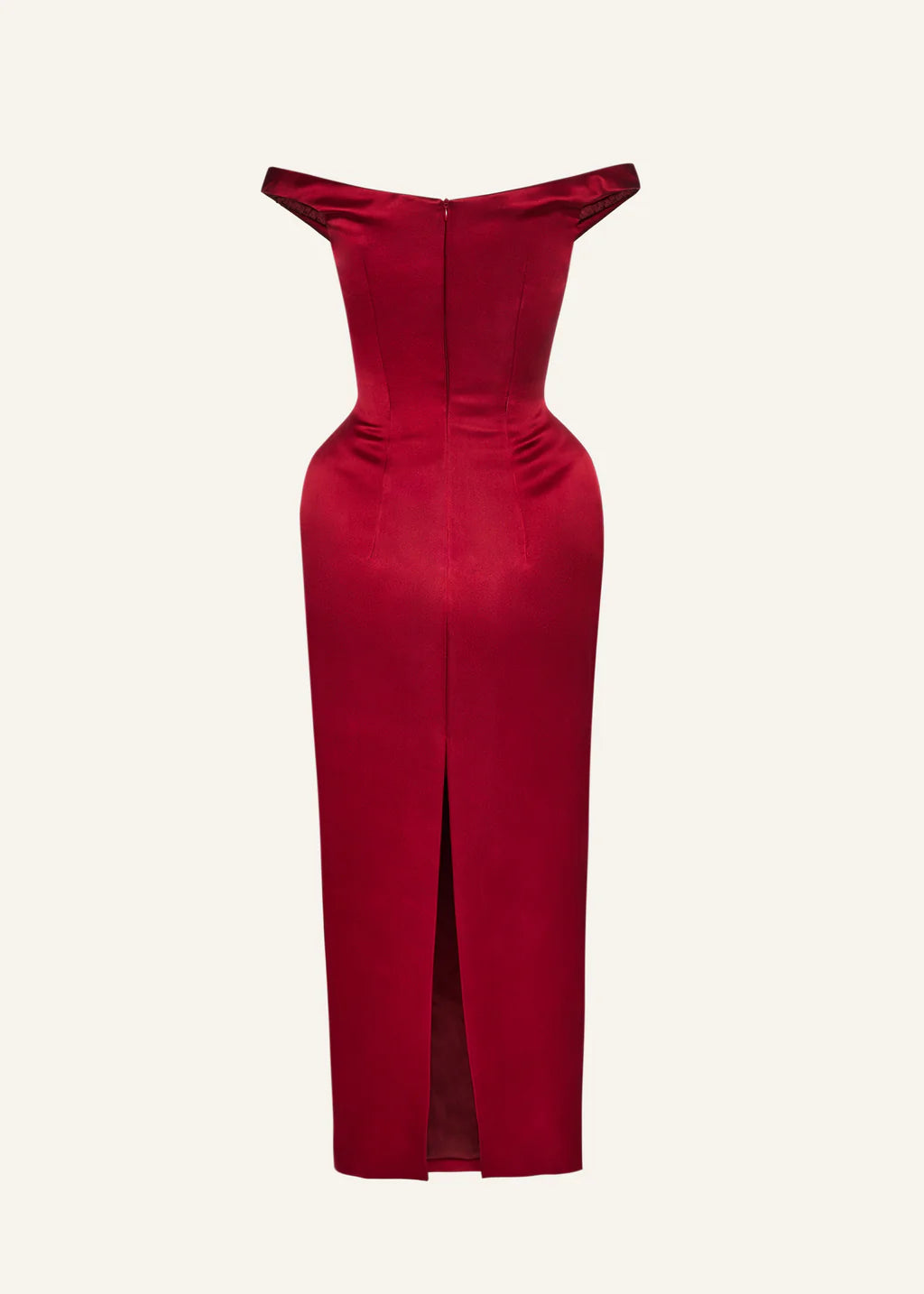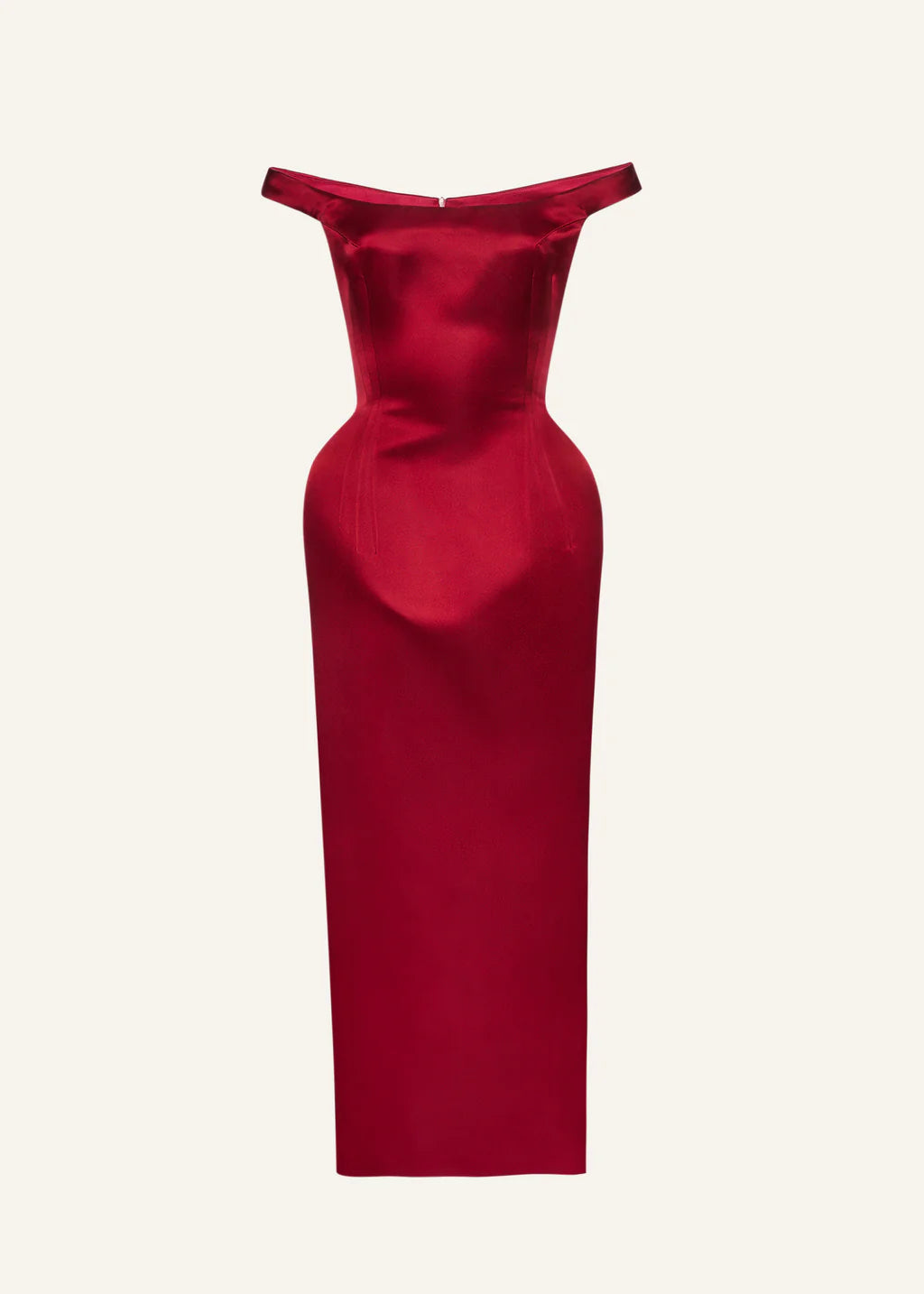 This ladylike midi dress is made from silk fabric and creates an hourglass shape by using hip pads and a fitted bodice, complemented by a rounded off-shoulder neckline.