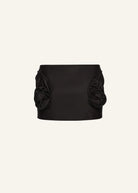 A low waist cotton mini skirt with rose appliqués at the hips.