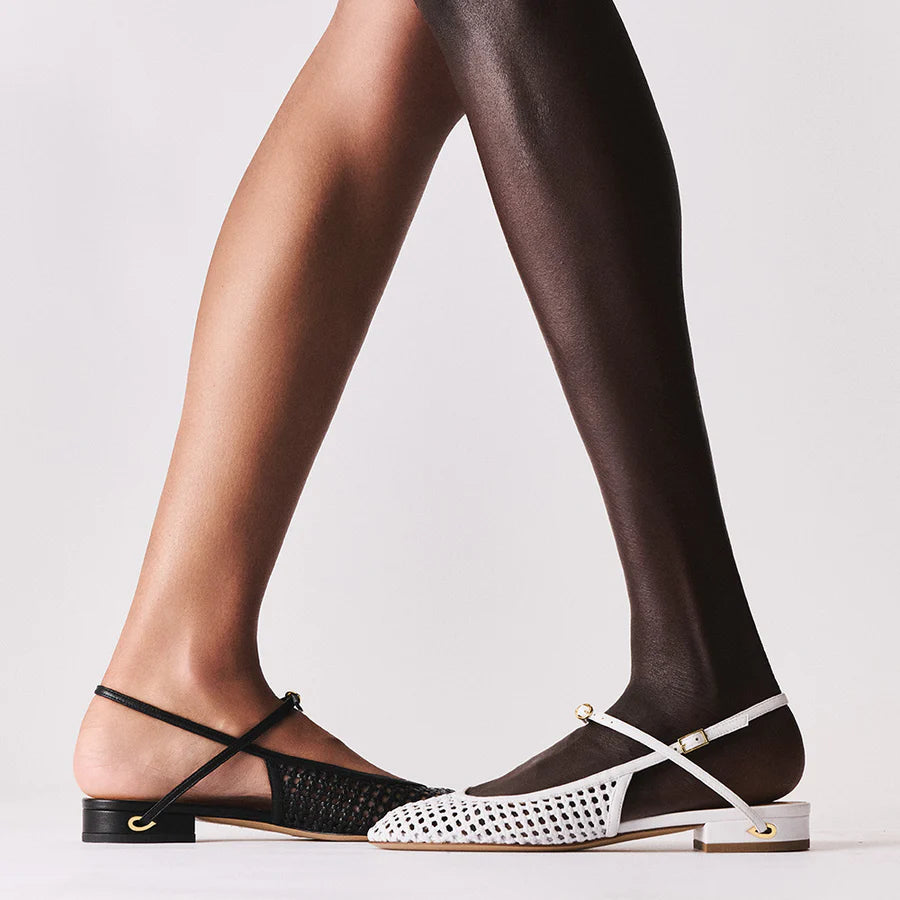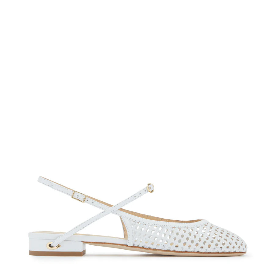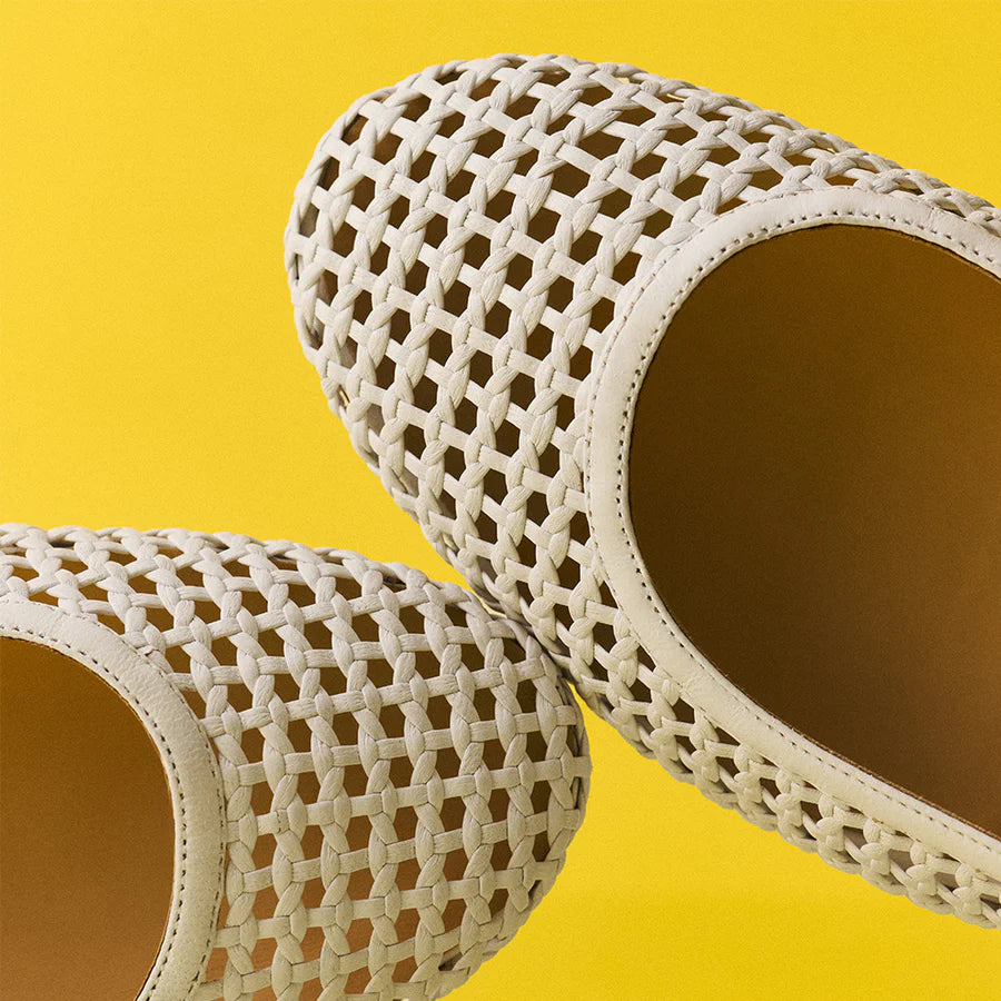 Handcrafted in Italy, the Mattia flat is realised in Jennifer Chamandi’s new signature infinity leather weave. Developed exclusively for the brand, the intricate weave forms a series of miniature ‘Eye of the Needle’ motifs together to create an airy, sculptural upper. Crafted in soft white nappa leather, they are the perfect addition to our summer wardrobe – comfortable and versatile.