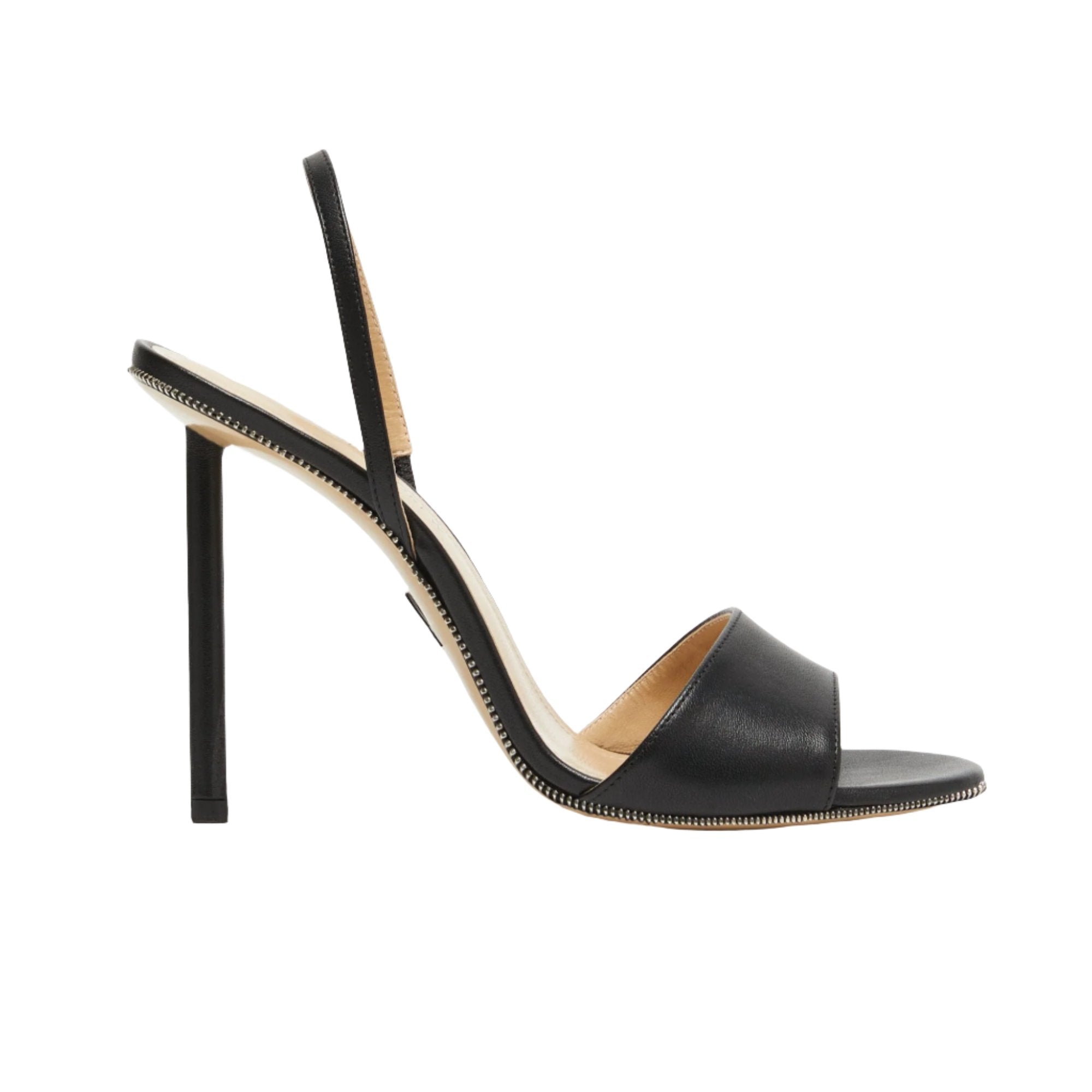 The Zippy Halter slingback sandal crafted in Paul Andrew's signature metal zip trim atop a slender spike heel.