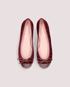Rosario high cut ballerina in dark red quilted velvet with black patent leather toe, rubber sole, leather insole and textile lining