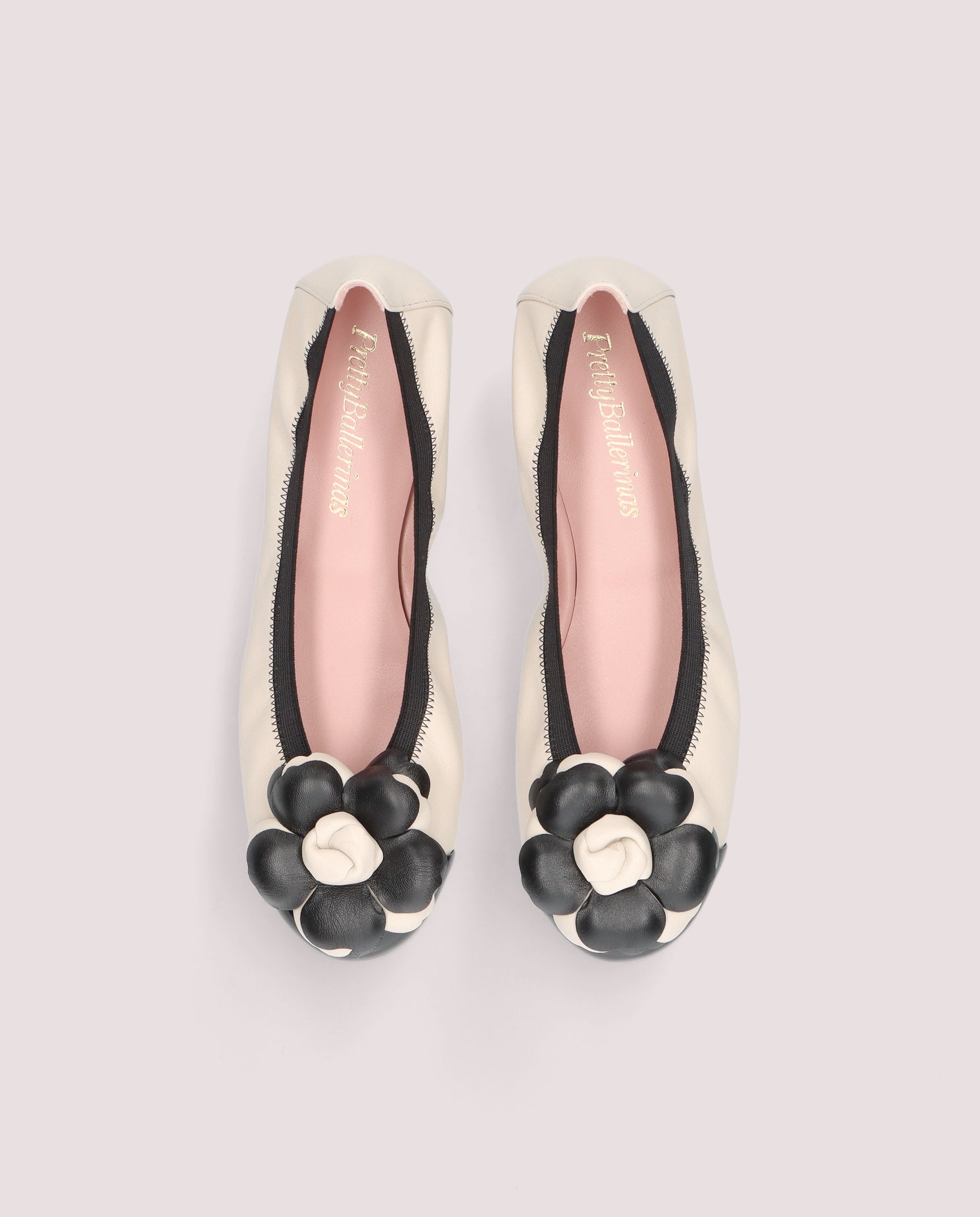 Shirley Flexible ballerina in white leather with black patent leather toe featuring handmade leather rosette detail with rubber sole, leather insole and lining.