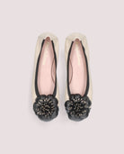 Shirley flexible ballerina in soft beige leather with black leather toe featuring handmade leather rosette detail with rubber sole, leather insole and lining.