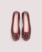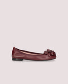 Shirley flexible ballerina in soft prune coloured leather featuring handmade leather rosette detail with rubber sole, leather insole and lining.