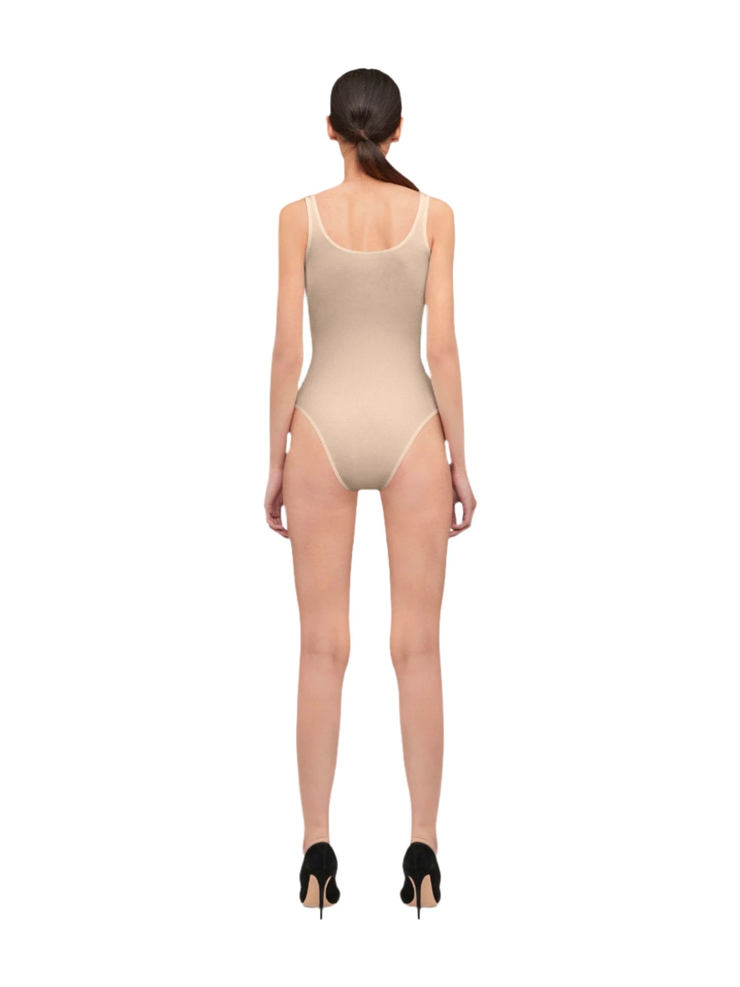 The simple, sleeveless bodysuit is made from opaque circular-knit material, with a shiny finish and fine trim around the neck and shoulders. A slim fit and deep, round neckline enhance the silhouette. The bodysuit is completed with a Brazilian-cut bottom.