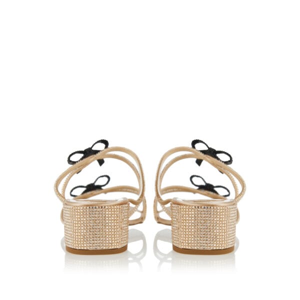 The Caterina sandal rewrites the codes of modern romanticism. This sophisticated and versatile style, functional and comfortable thanks to the block heel, is characterized by the three classic crystal bows