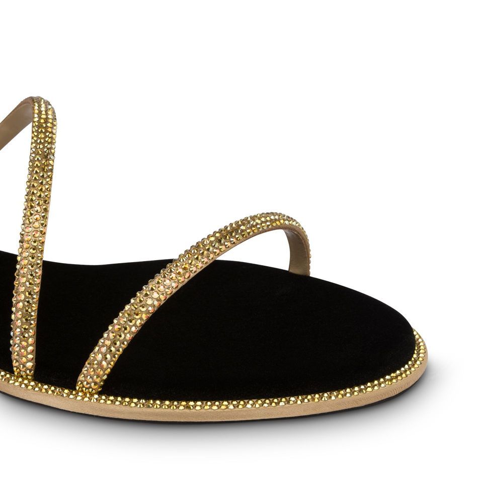 Versatile, functional and timeless: for the winter season, the Cleo flat sandal is designed with a black velvet insole and the distinctive serpente in golden satin and rhinestones. Made in Italy, it is the fundamental piece for building a refined and chic look.