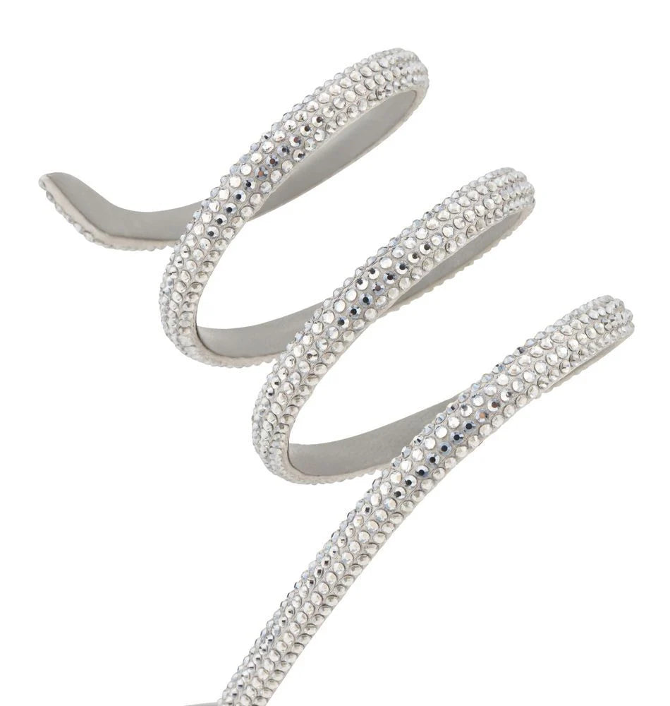 The bejeweled Cleo sandal in gray with silver crystals is a timeless must-have to wear on repeat. This version with a practical mid-height block heel, two upper bands, and the hallmark coiled snake strap is finished with a star-dusted sole.