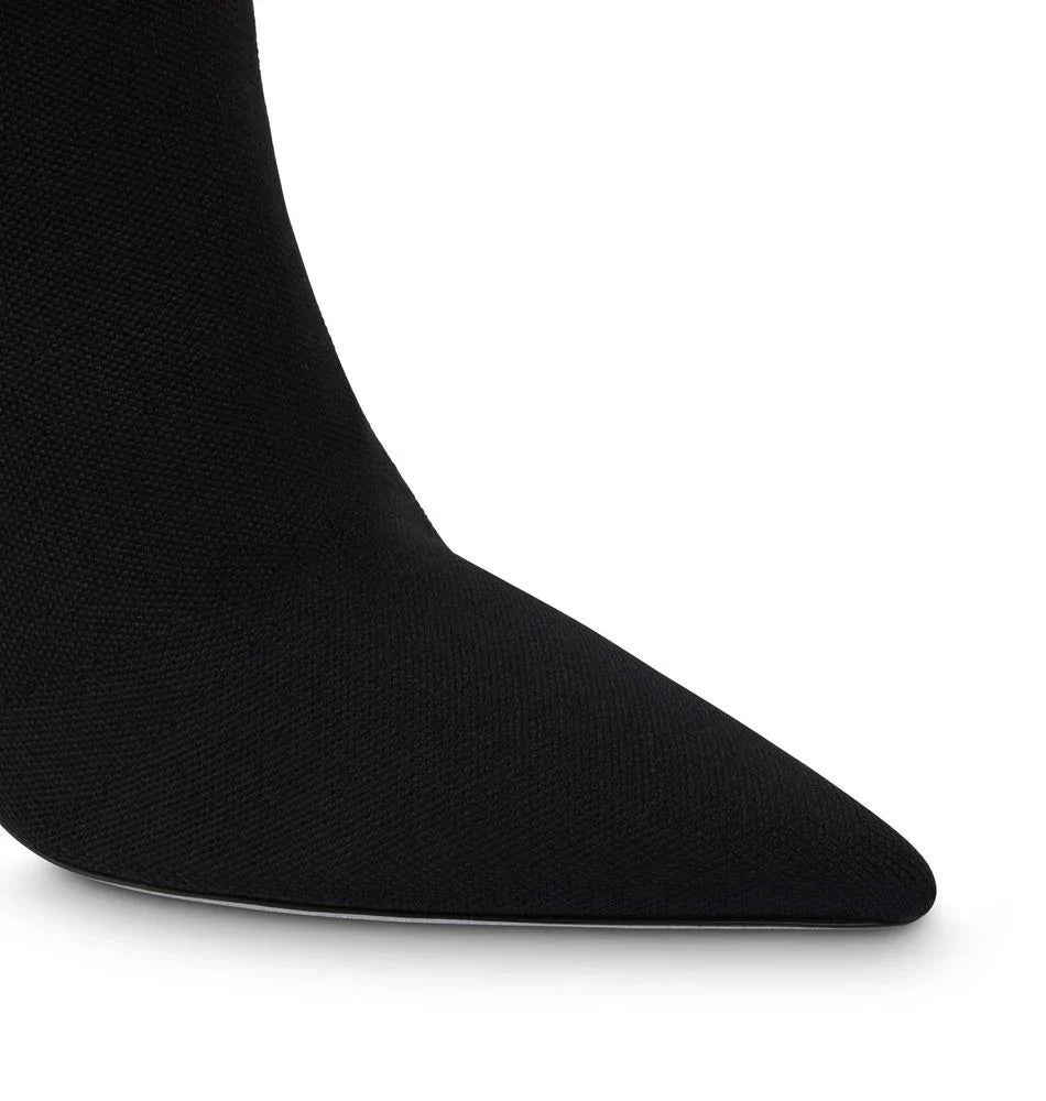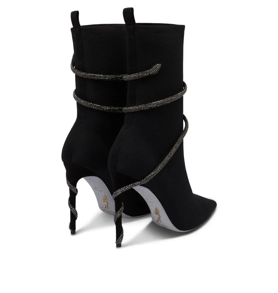 For the colder months, the Margot ankle boot enters the scene. In black stretch knit, this Made in Italy style promises maximum versatility thanks to the above-the-ankle design but also a certain audacity given by the satin serpente covered with tone-on-tone rhinestones. The final touch is the signature stardust sole.