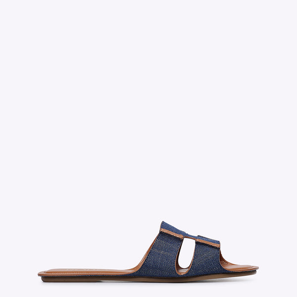 The iconic Sellier slipper from the Maison, crafted in precious calfskin and denim, represents the perfect combination between lightness and style.