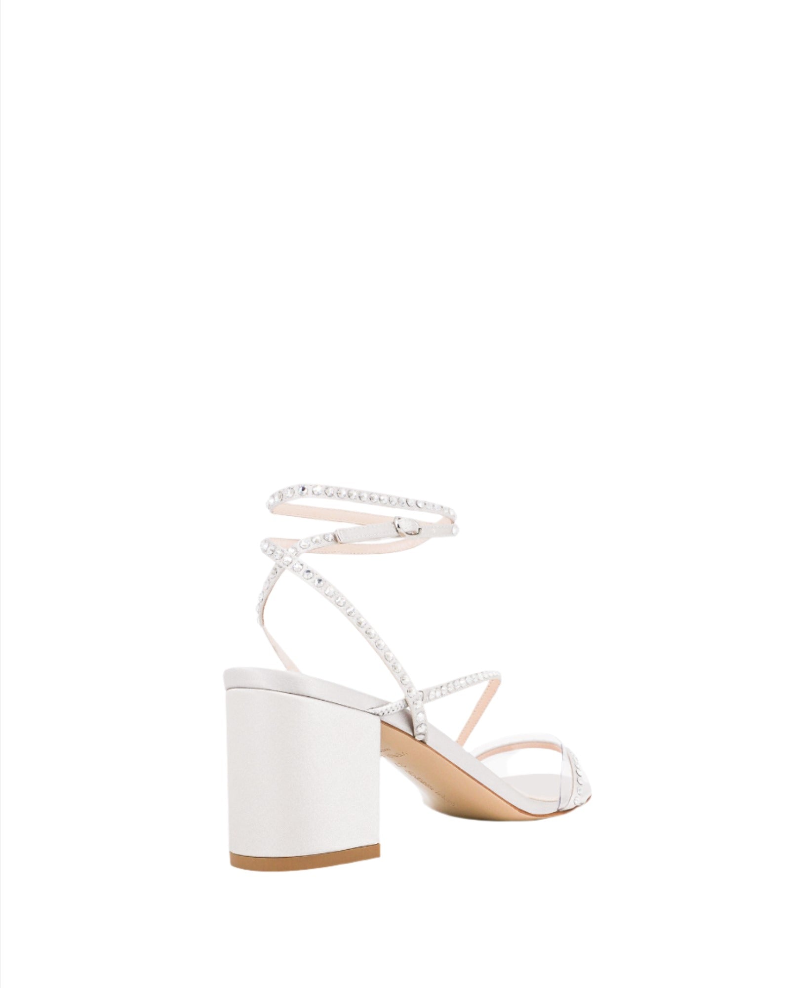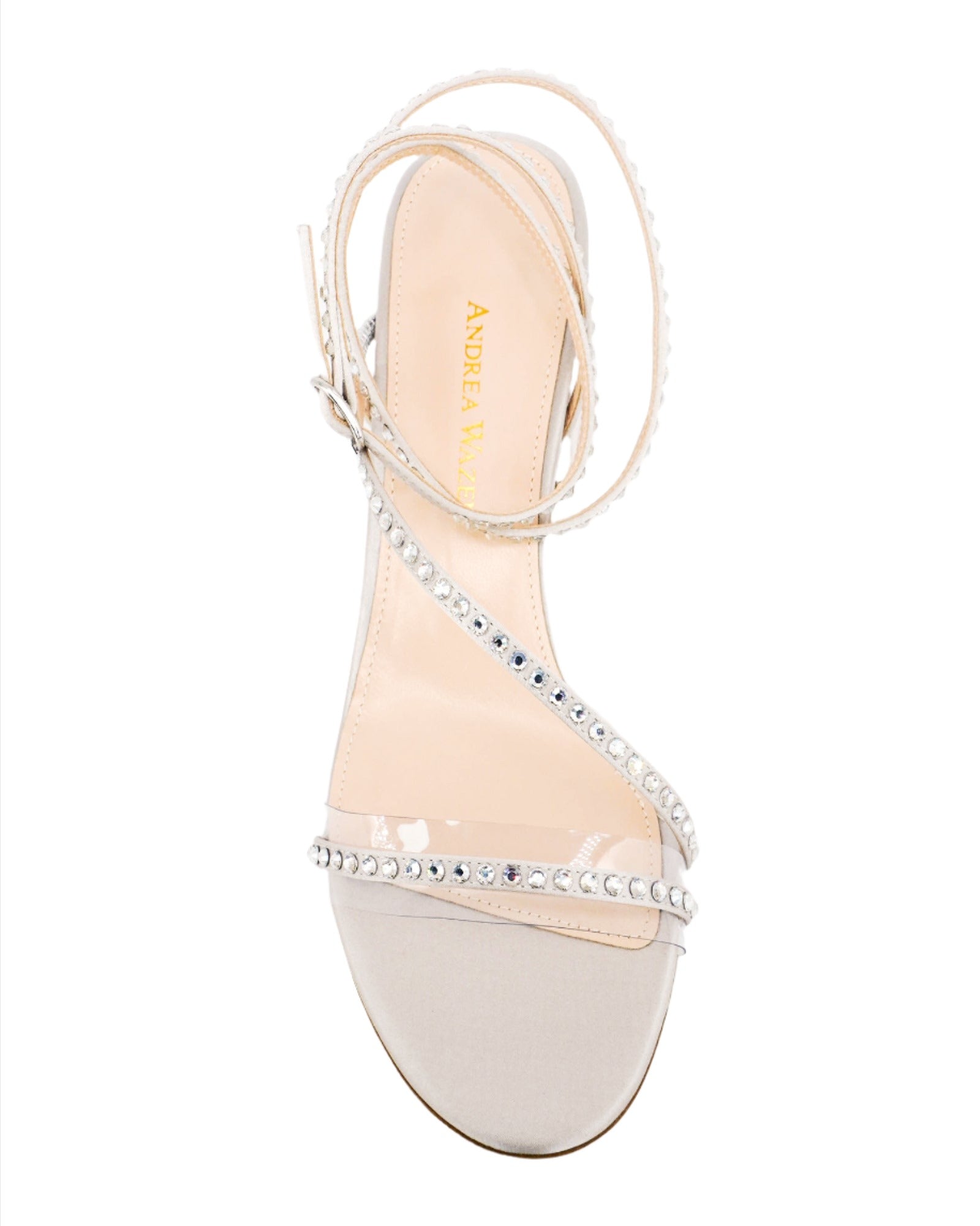 The DASSY BLOCK is a stylish reinterpretation of Andrea Wazen's popular PVC Dassy Pumps. With an open toe, block heel, and chic diagonal and double ankle straps, this sandal is adorned with shimmering crystals and leather accents for a touch of glamour. It's a modern and sophisticated choice, showcasing Andrea Wazen's flair for blending contemporary design with luxurious details.