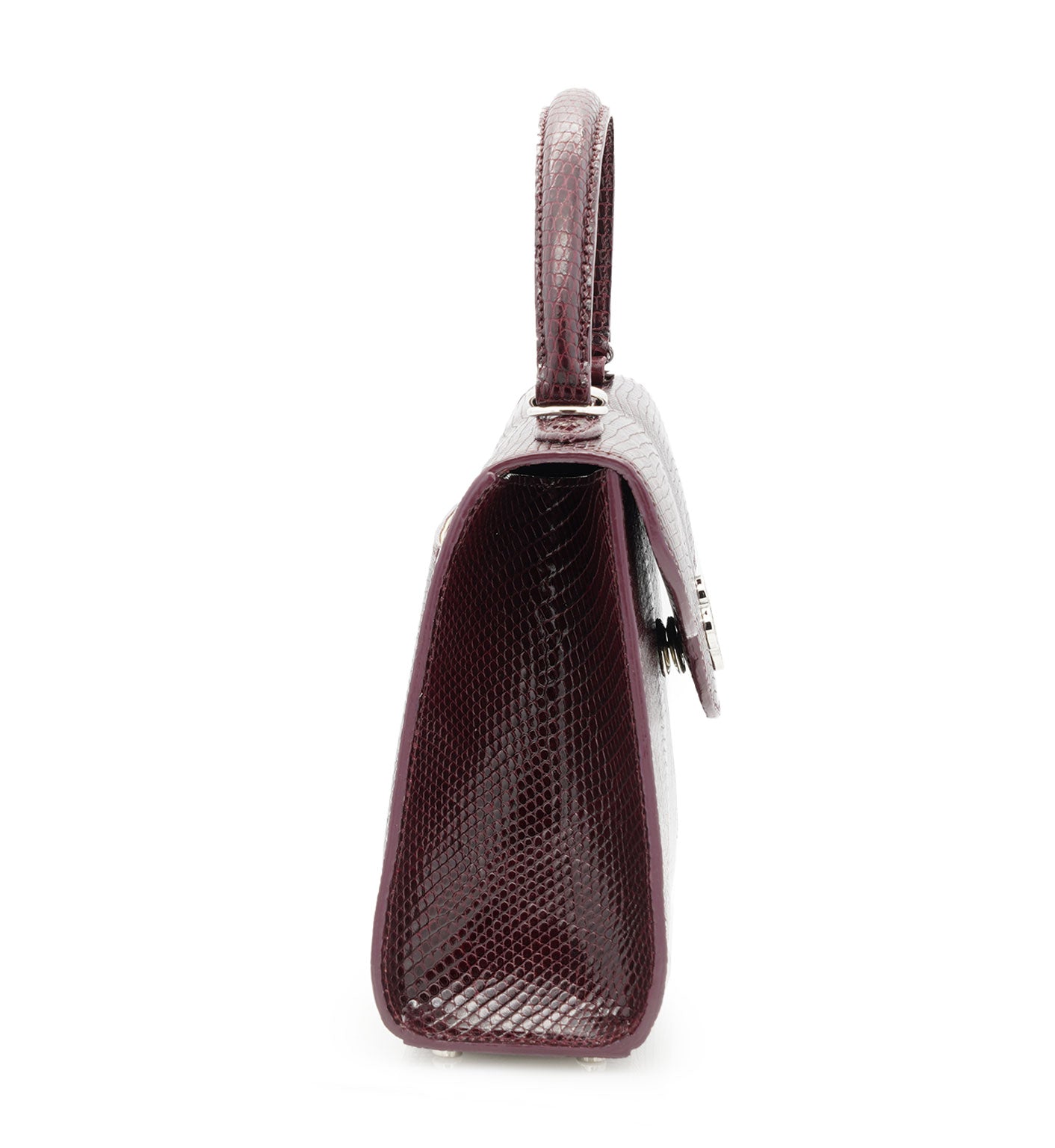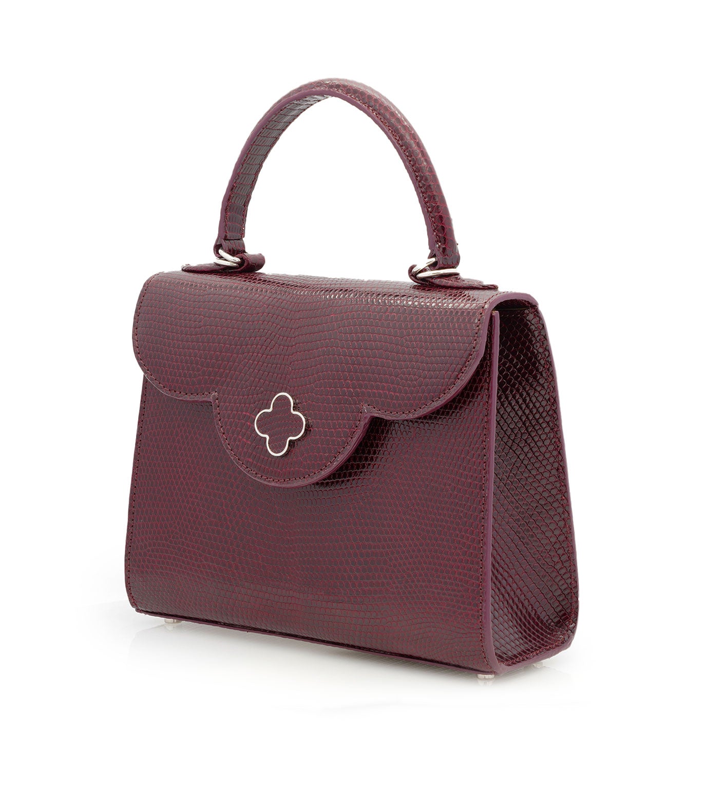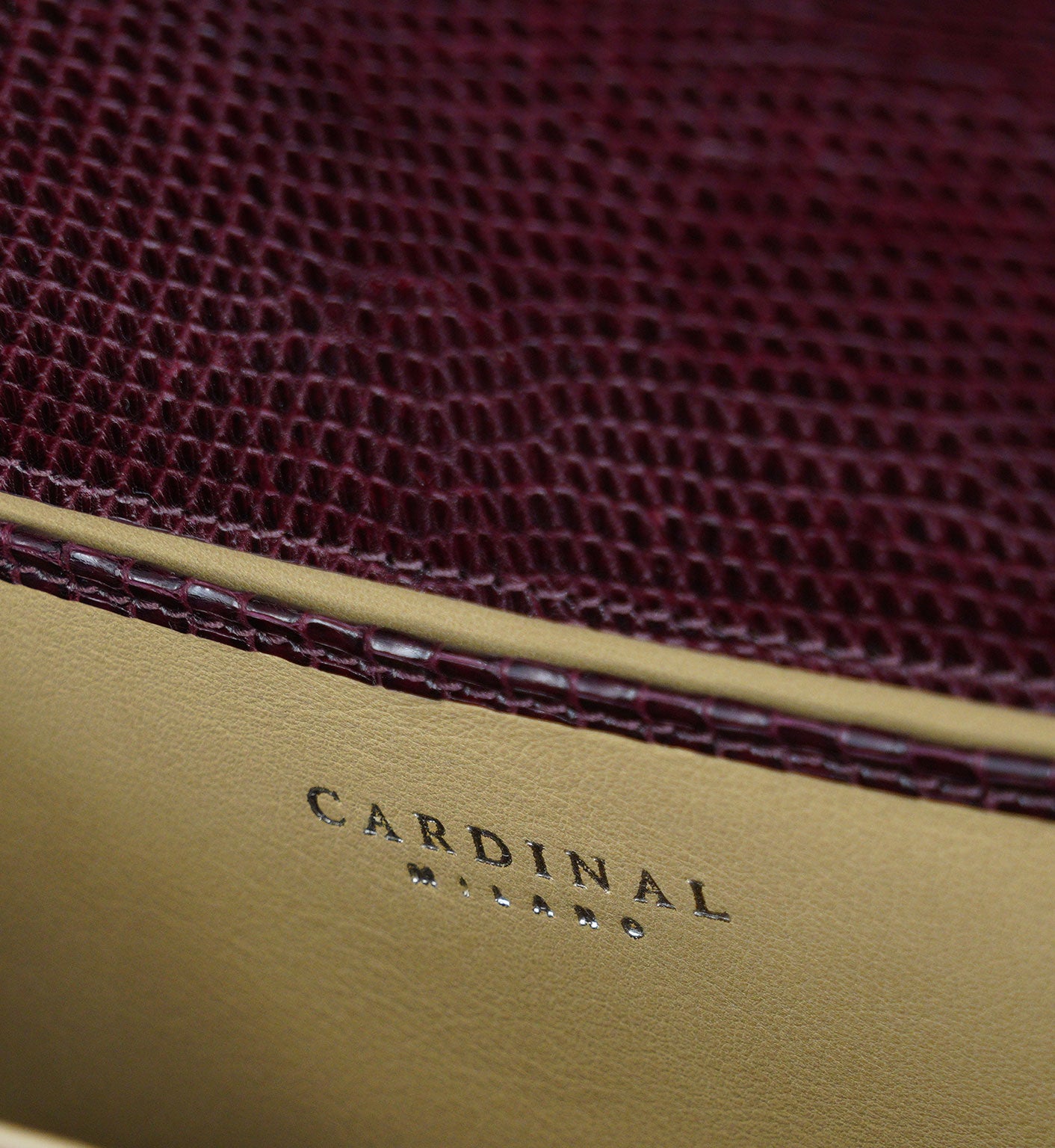 Iconic Cardinal 'First Lady' bag has a pure, structured and ladylike shape.This bestseller model is released with a new Cardinal logo as lucky clover as one of the characteristic symbols of Milan art and architecture . This timeless bag is handcrafted in Milan from genuine lizard leather in very versatile and elegant burgundy color. The top handle is comfortable for hand or elbow carry and a removable strap for over-the-shoulder wear. A magnetic closure keeps your essentials safe, there are one external and one internal pockets.To dress - from morning to evening.