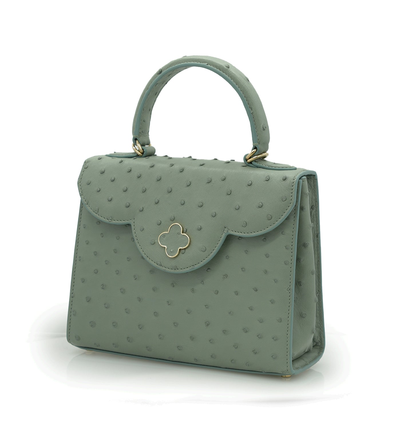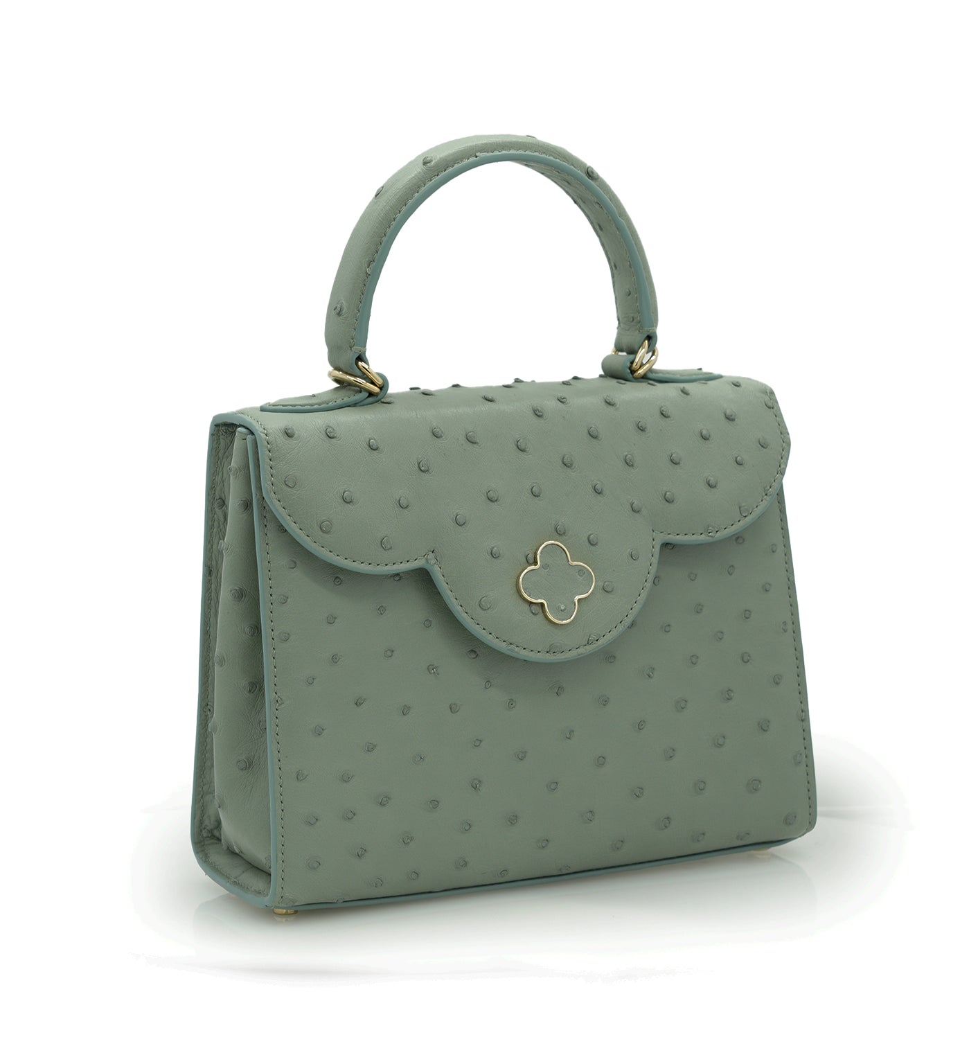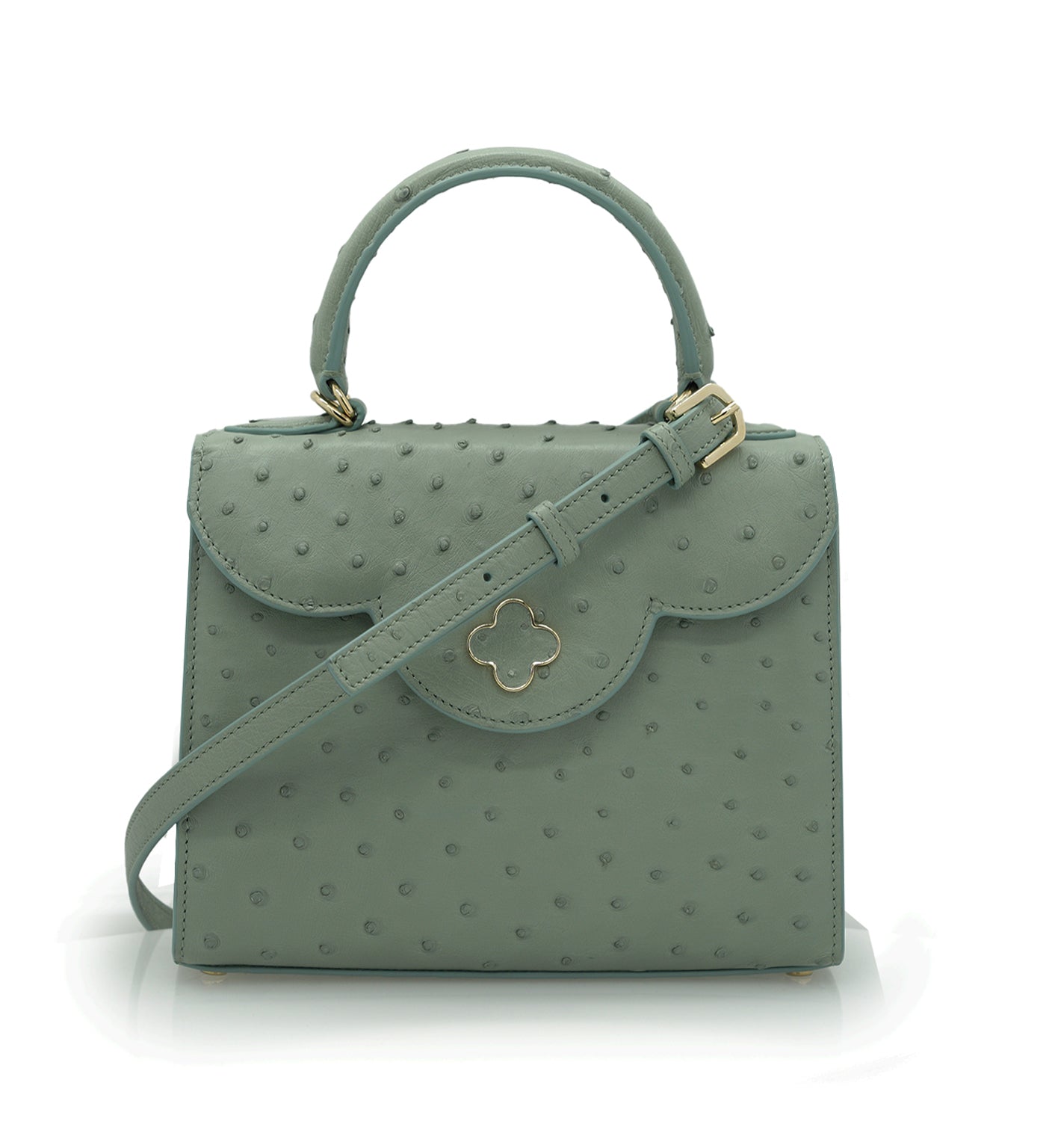 CARDINAL Milano signature First Lady top handle bag is perfect accessory to wear cross seasons. This bag is perfect for any occasion. The bag has been made in Milan by experted artisans in clean elegant shape. It is handcrafted from genuine ostrich leather in elegant salvia leaves color, detailed with a brand lucky flower logo with leather insert. The top handle is comfortable for hand or elbow carry and a removable adjustable leather strap for over-the-shoulder wear. The bag is roomy enough for your essentials like small wallet, phone, keys and make up. A magnetic closure keeps your essentials safe, there is one internal pocket. This chic accessory will make a lady look more cute and so elegant at the same time. With genuine Ostrich leather handbag you will looks gorgeous in any occasion of your life.