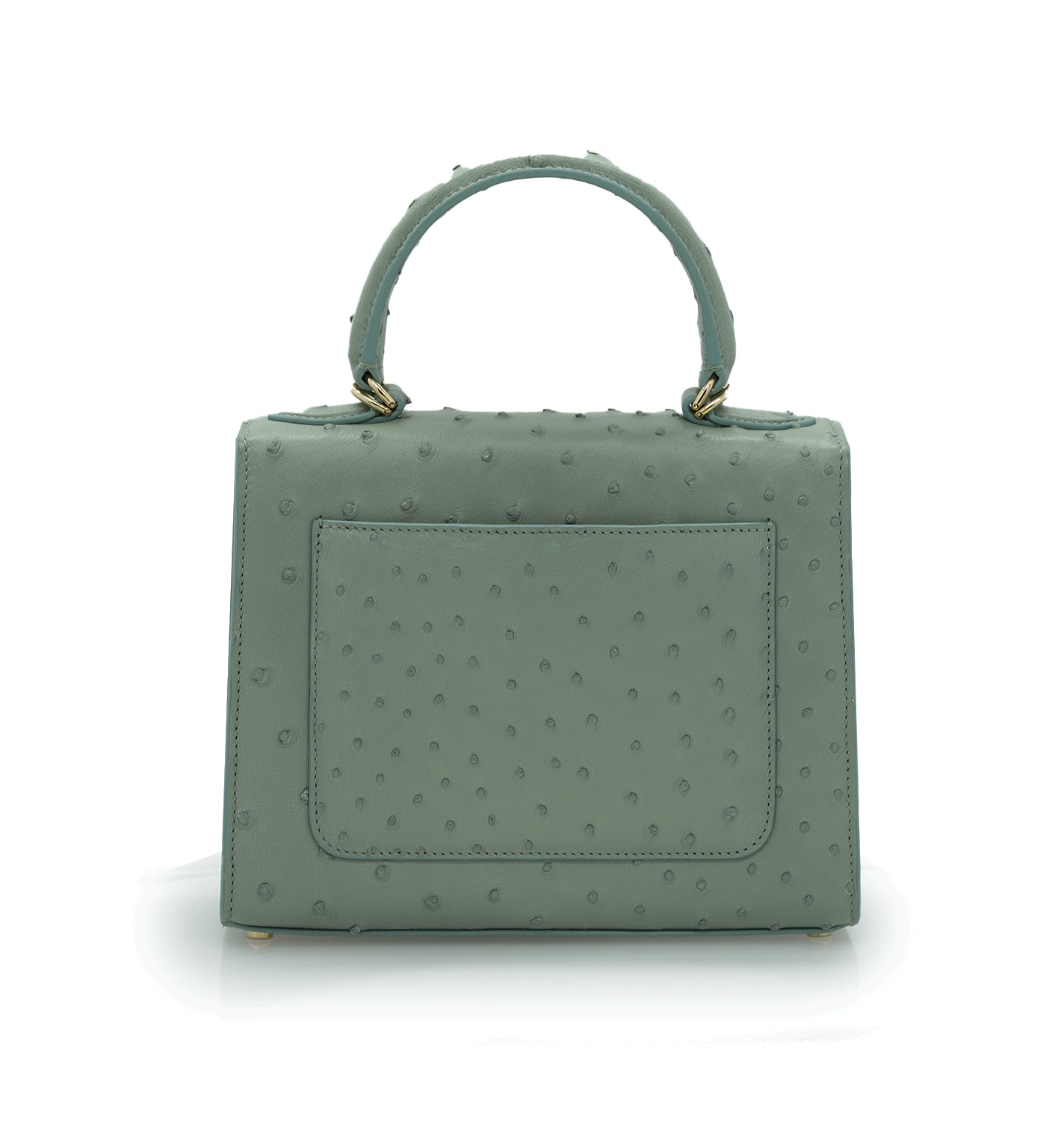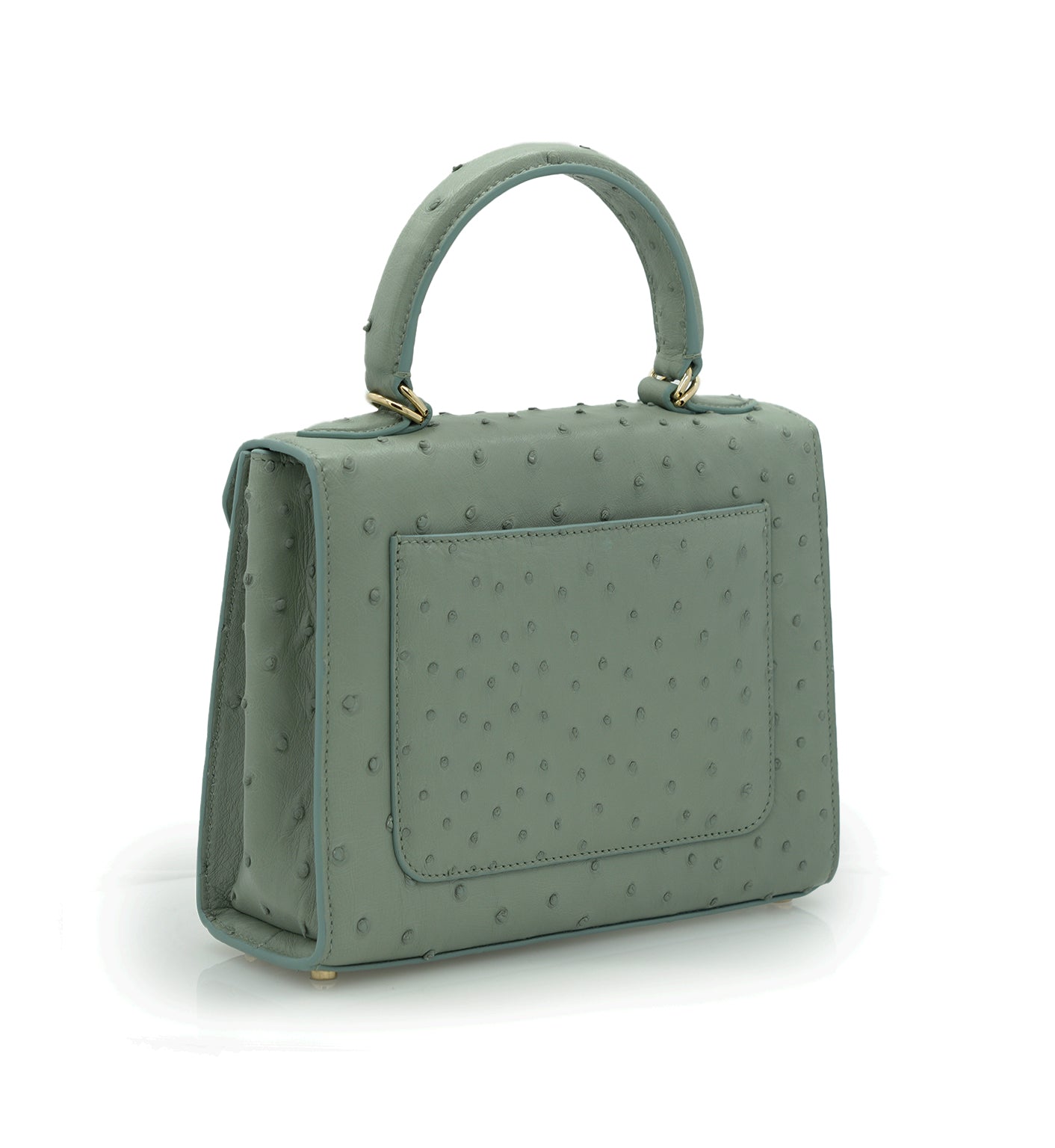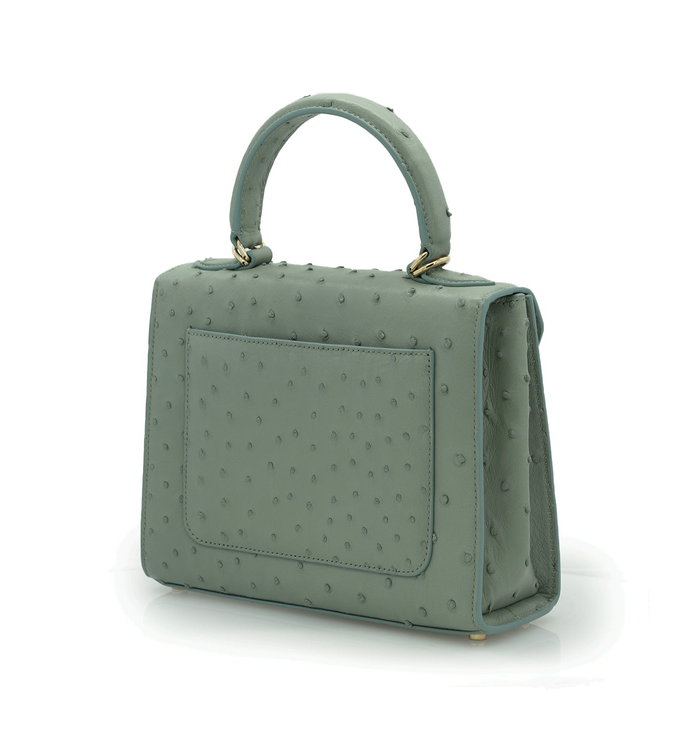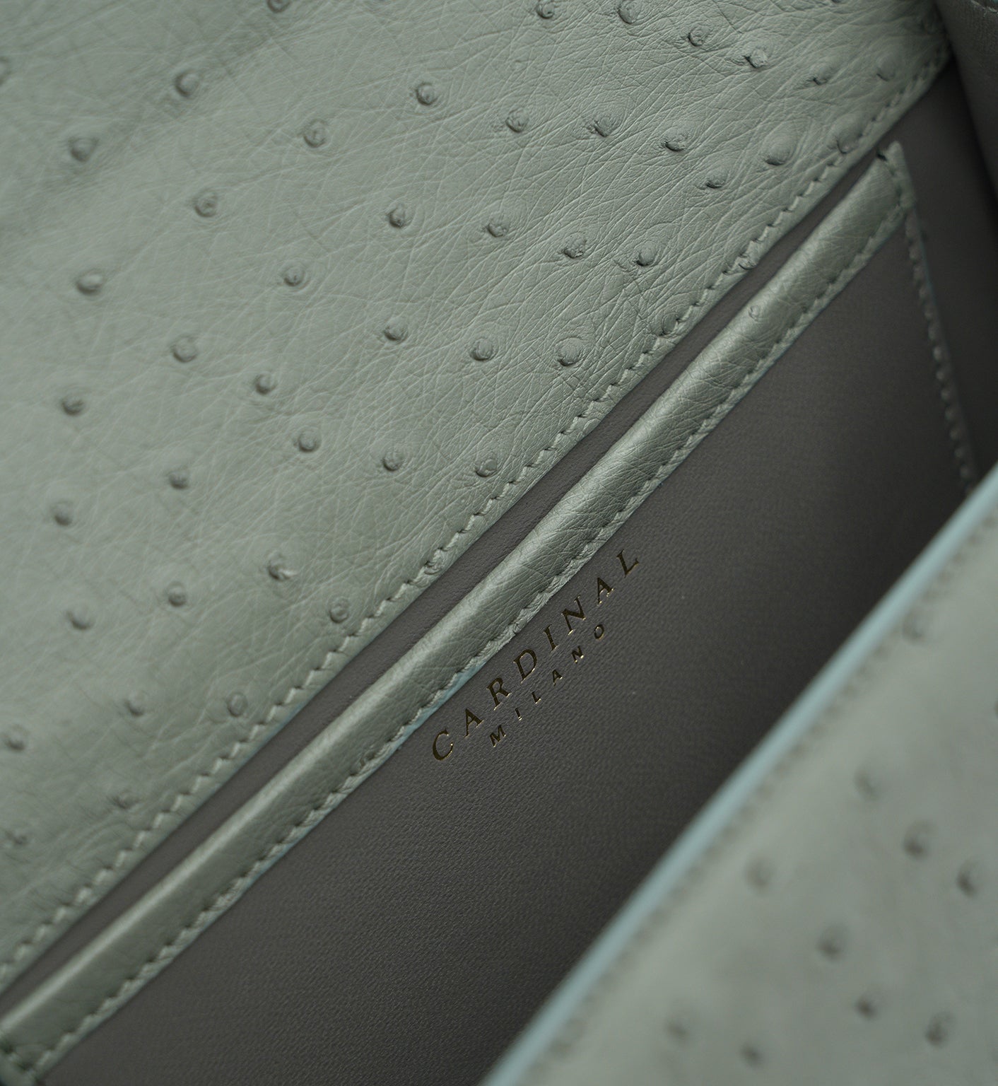 CARDINAL Milano signature First Lady top handle bag is perfect accessory to wear cross seasons. This bag is perfect for any occasion. The bag has been made in Milan by experted artisans in clean elegant shape. It is handcrafted from genuine ostrich leather in elegant salvia leaves color, detailed with a brand lucky flower logo with leather insert. The top handle is comfortable for hand or elbow carry and a removable adjustable leather strap for over-the-shoulder wear. The bag is roomy enough for your essentials like small wallet, phone, keys and make up. A magnetic closure keeps your essentials safe, there is one internal pocket. This chic accessory will make a lady look more cute and so elegant at the same time. With genuine Ostrich leather handbag you will looks gorgeous in any occasion of your life.