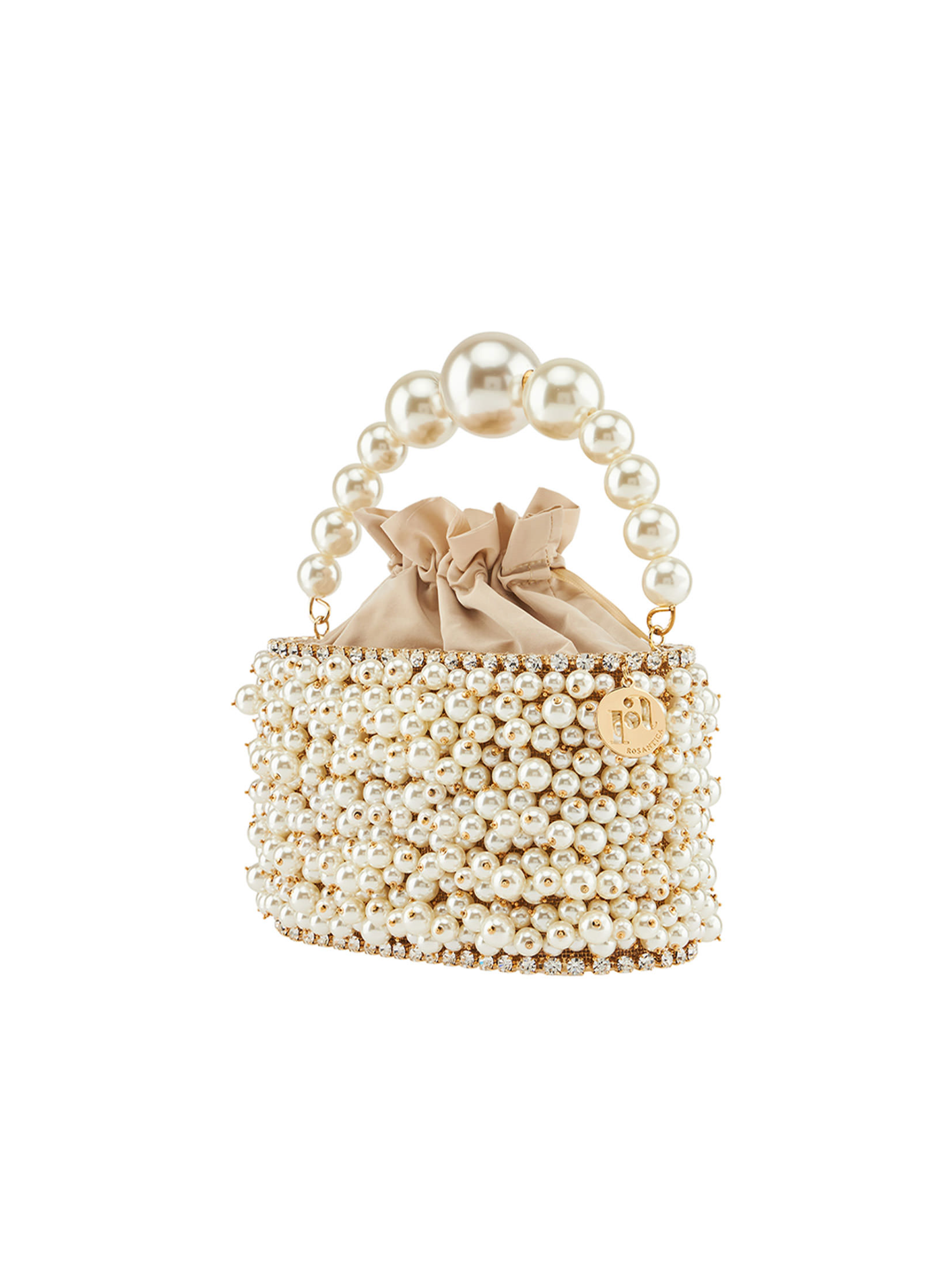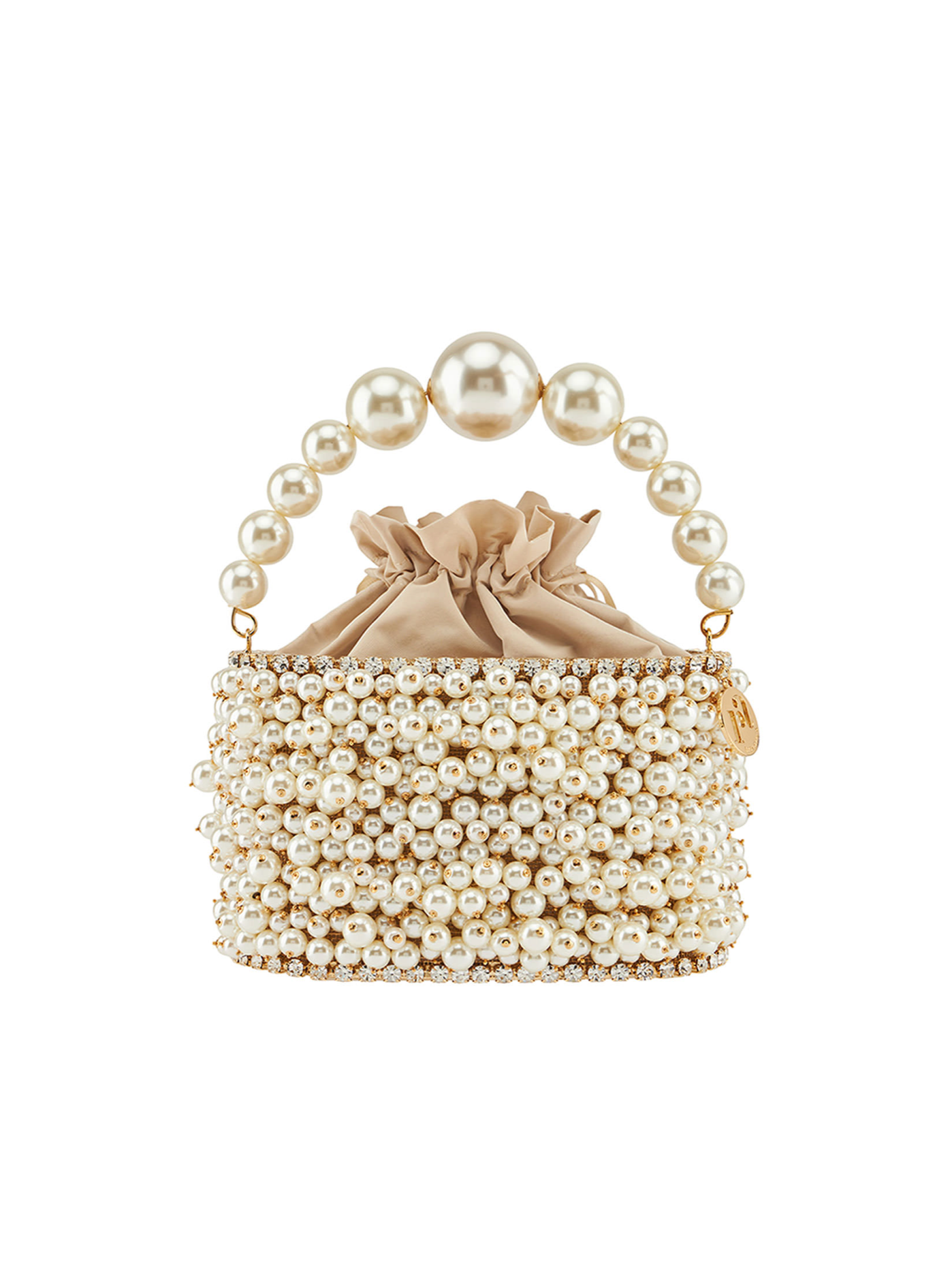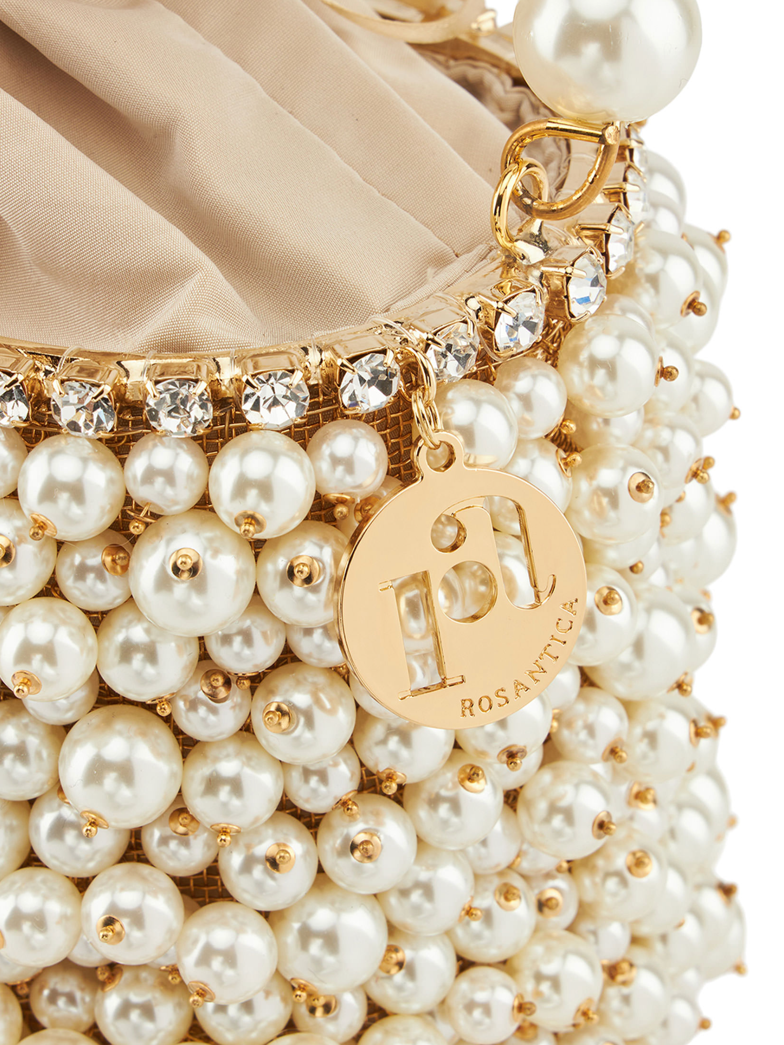 The "Holli Osiris" handbag is handmade with brass, faux pearls, crystals, and fabric. Gold-toned brass accents highlight its delicate design, making it a symbol of grace, artistry, and timeless Italian sophistication.