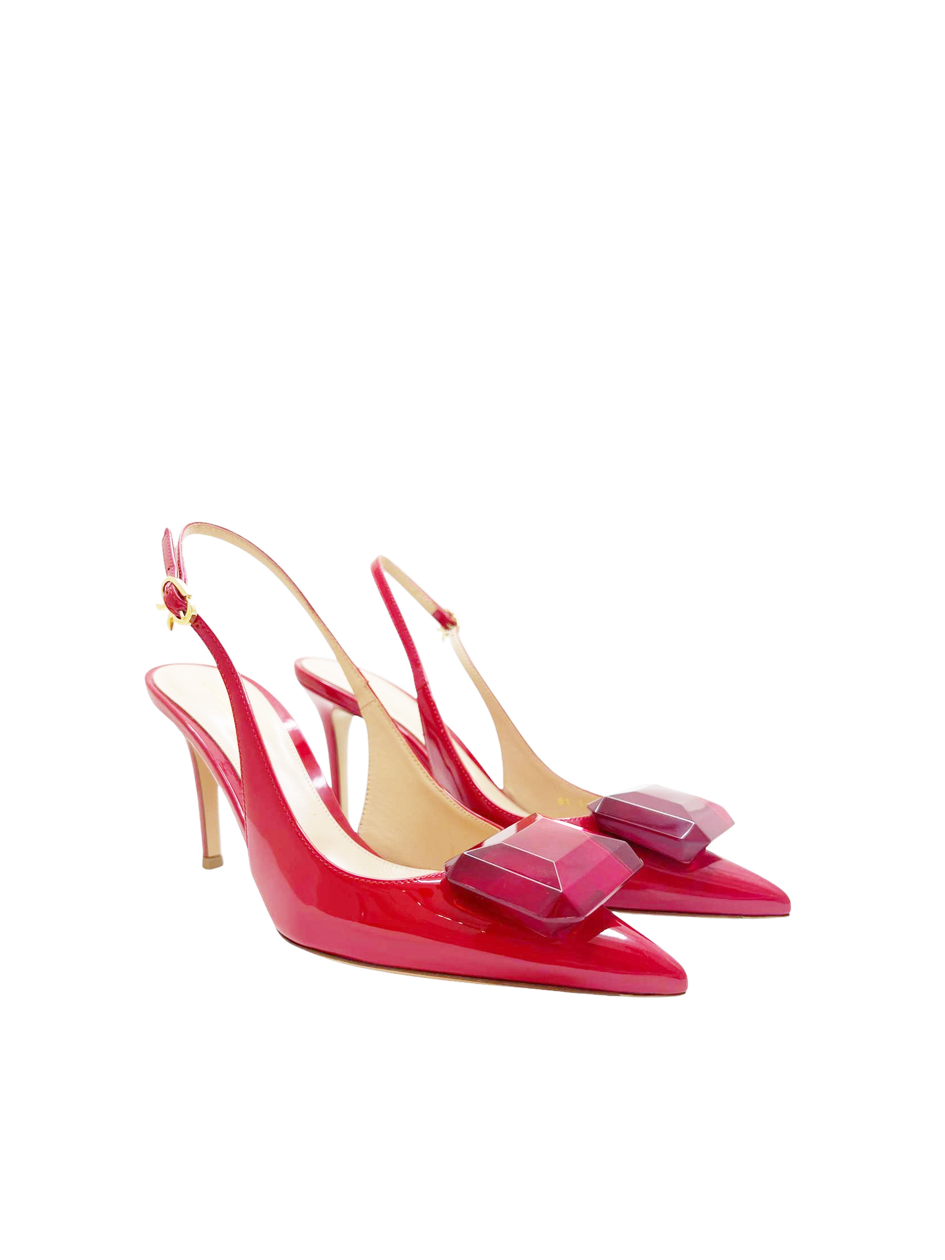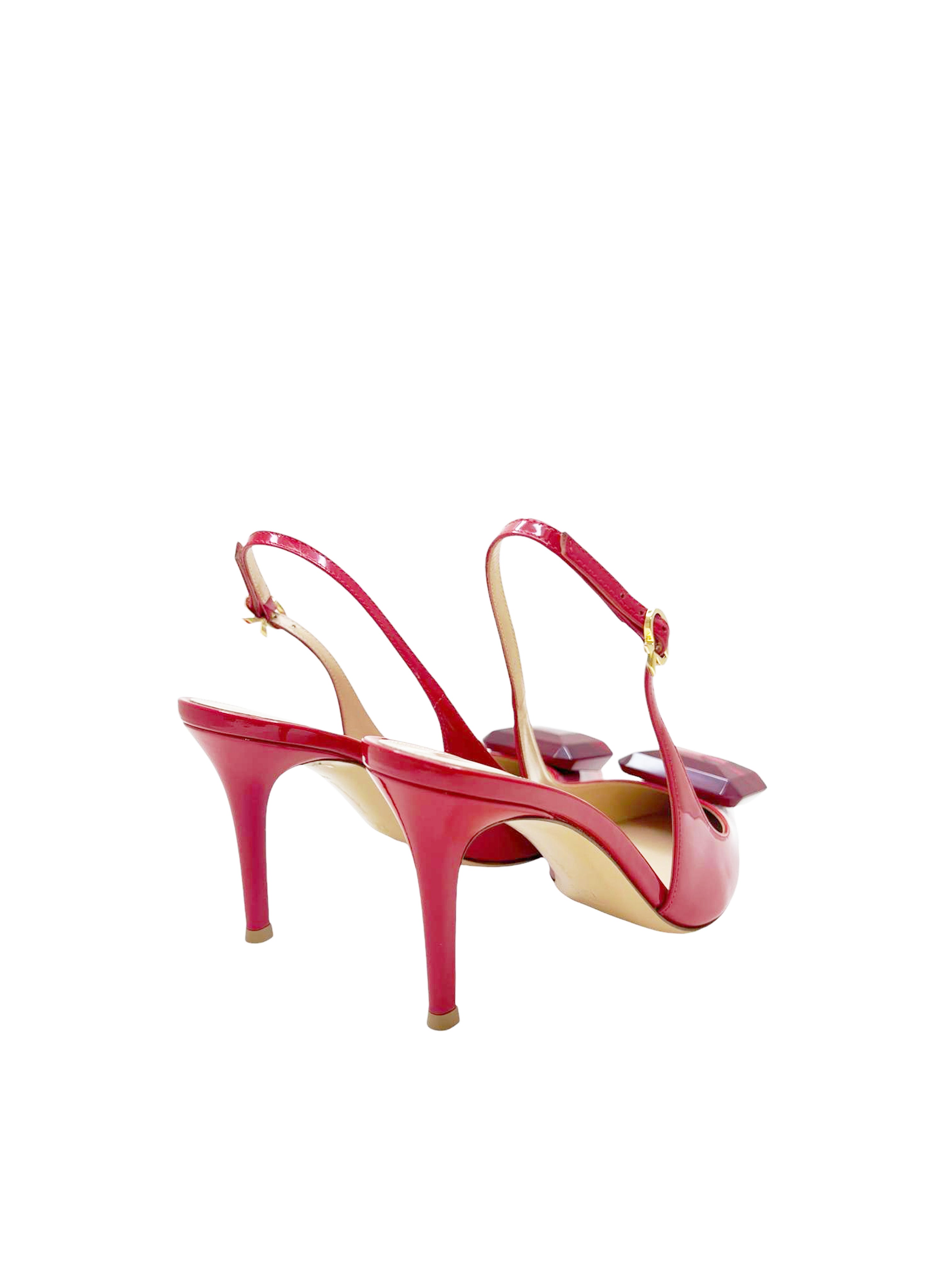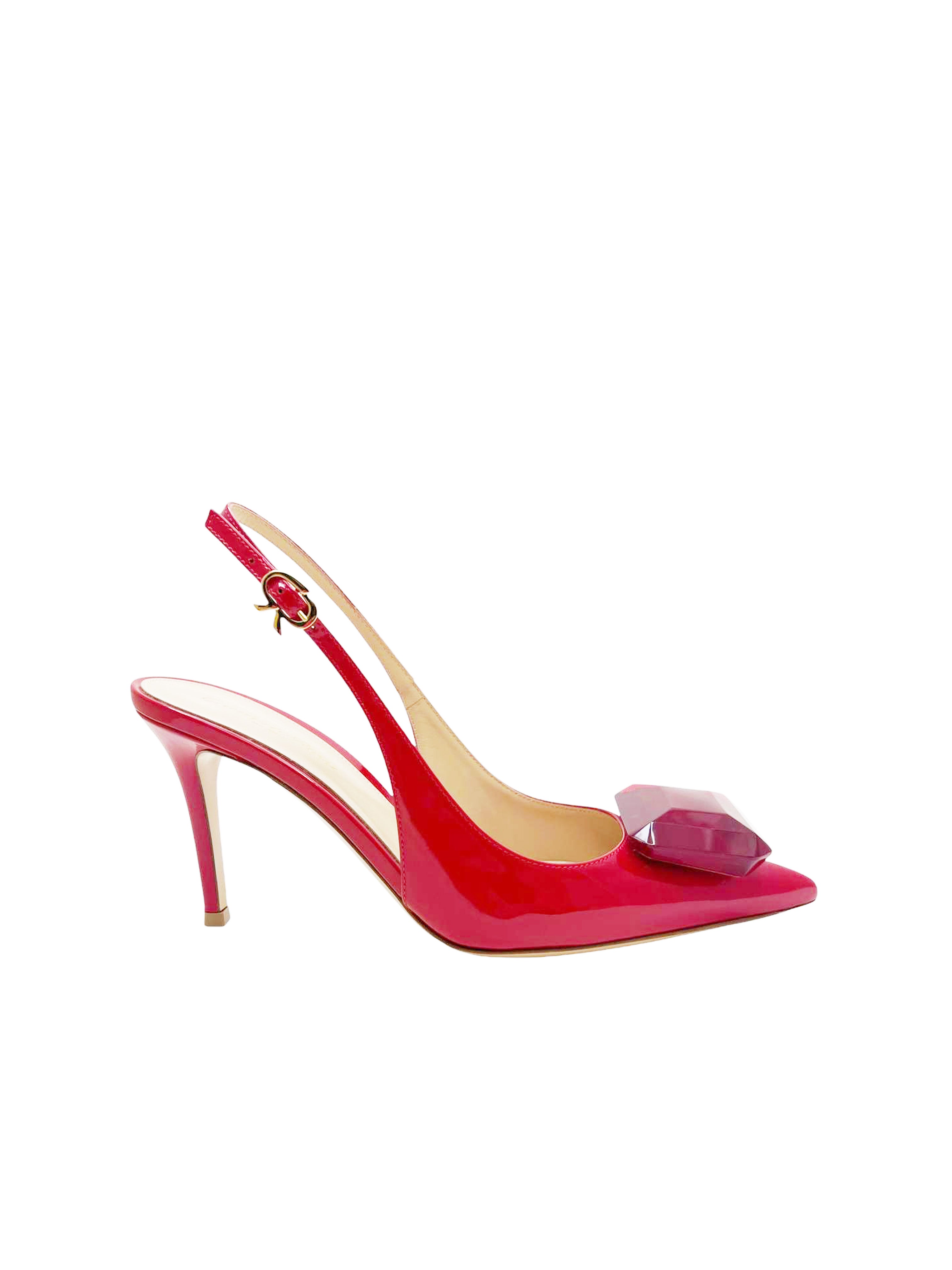 Jaipur Sling is a pointed-toe slingback with an 85mm stiletto heel and the signature Ribbon buckle at the ankle strap. The custom-made emerald cut gemstone brings an unexpected decoration into the brand's minimalist aesthetic. Handmade in Italy.