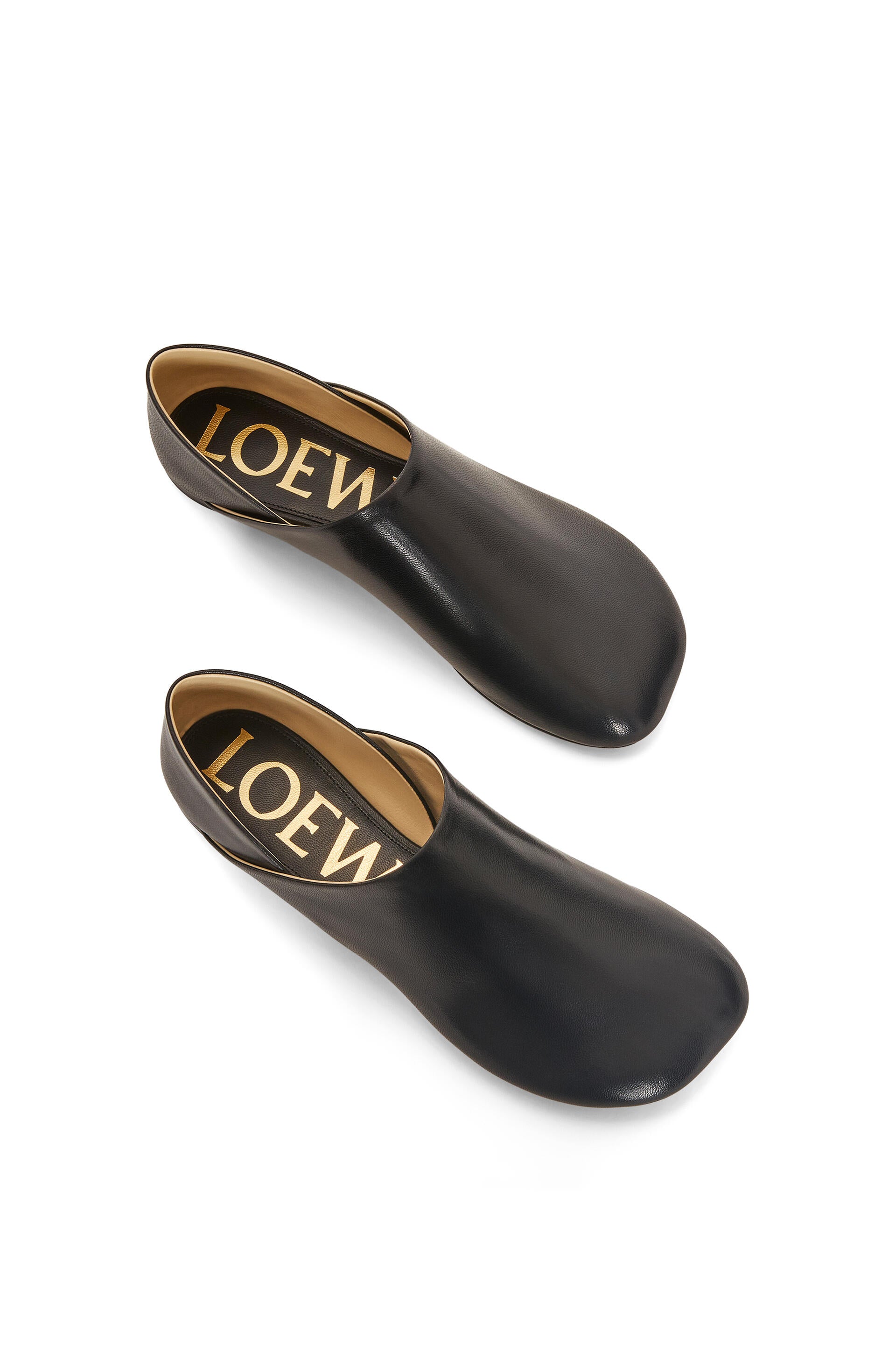 Second skin slippers in goatskin with a petal shaped toe. The SS23 shoe collection plays on tension and contrast: handcraft clashes with a fetish attitude and natural materials collide with the technical. Key details include playful heels, graphic logos and asymmetric toes and straps.