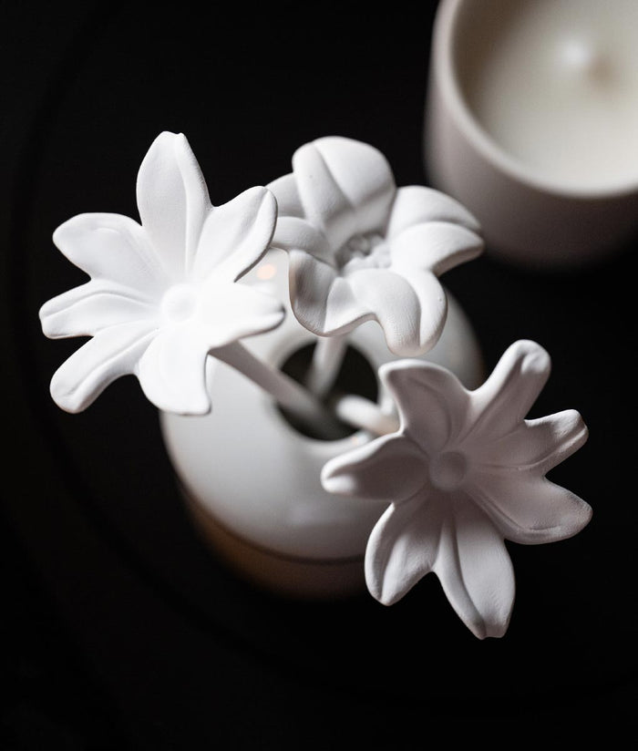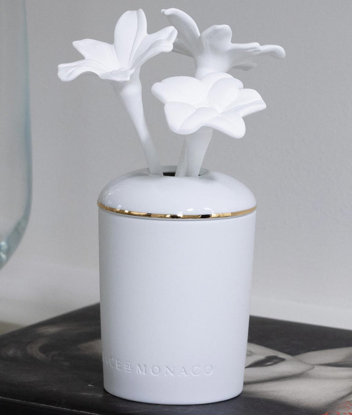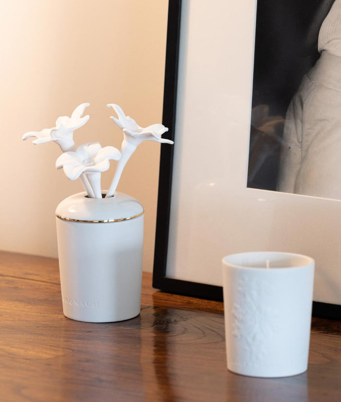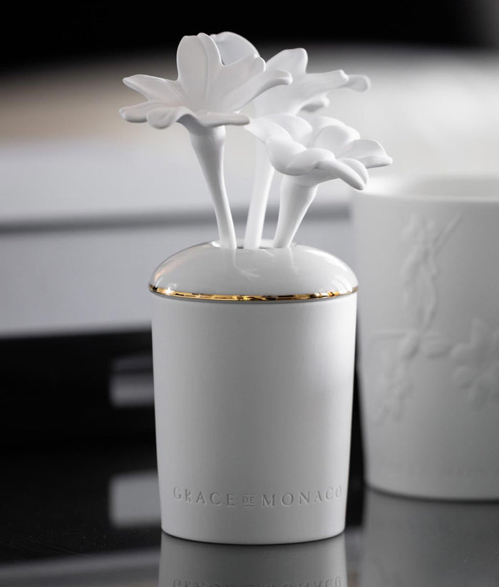 Our innovative ceramic casting process diffuses the fragrance gently and with delicate balance creating an atmosphere that fills the home with a warm, inviting, yet subtle fragrance. Composed of a bouquet of flowers inspired directly by Princess Grace’s love of floral design and her love for her three children.