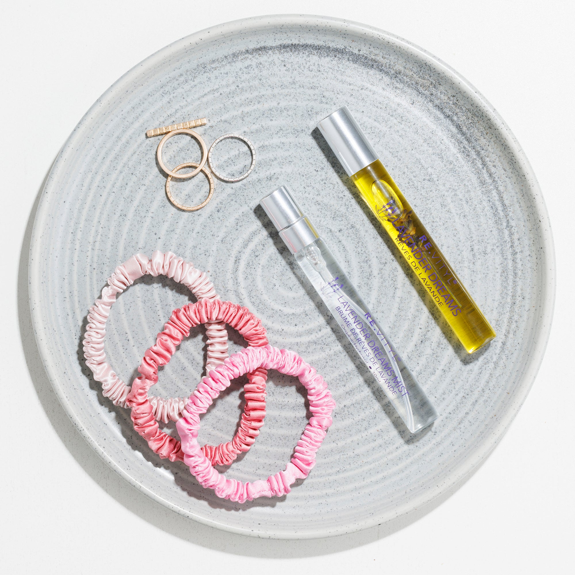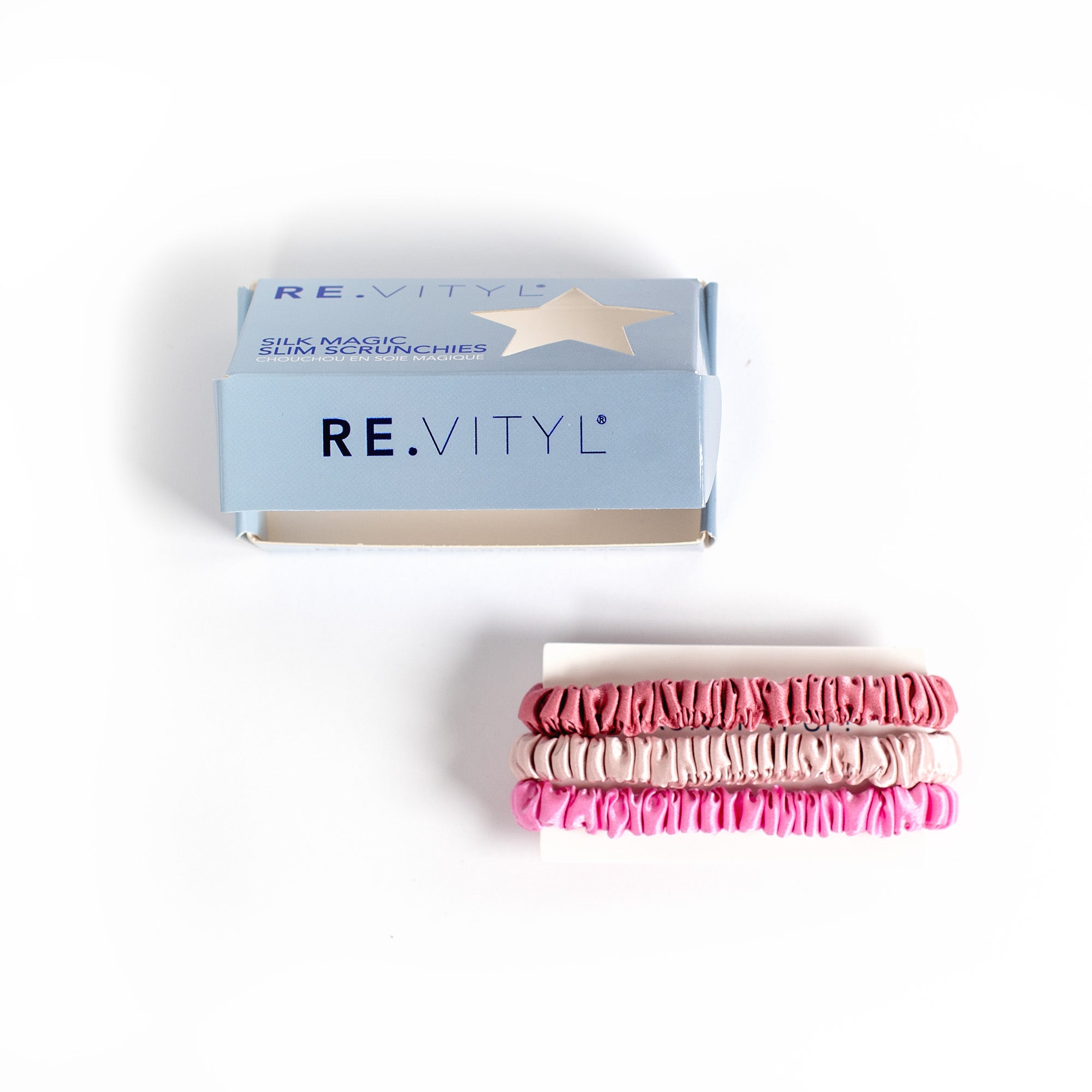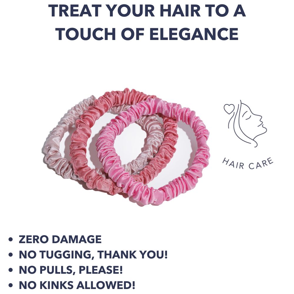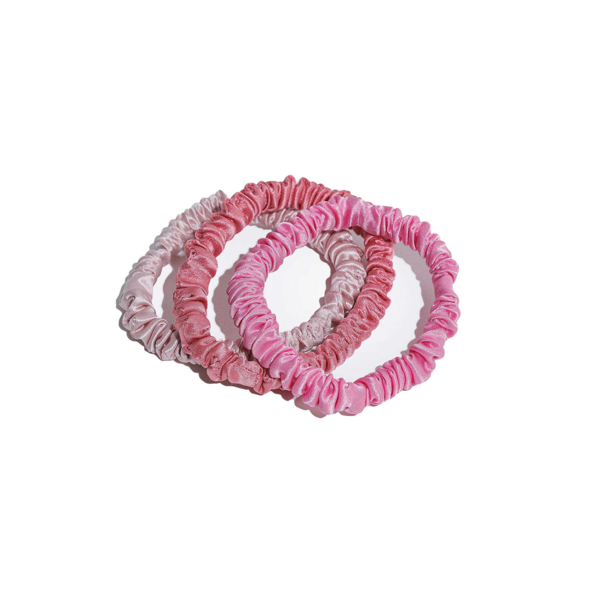 Experience Silk Magic from Day to Night with our luxurious silk scrunchies. Trust us, your hair will thank you for it. The trio of slim silk hair ties, in a range of pink hues, are crafted of the finest STANDARD 100 by OEKO-TEX® certified Mulberry Silk with a gentle let flexible elastic. The perfect compliment to pair with your Sleep Magic Sleep Mask in Pink Clouds, or our Sleep & Skin Set for maximum self-care!