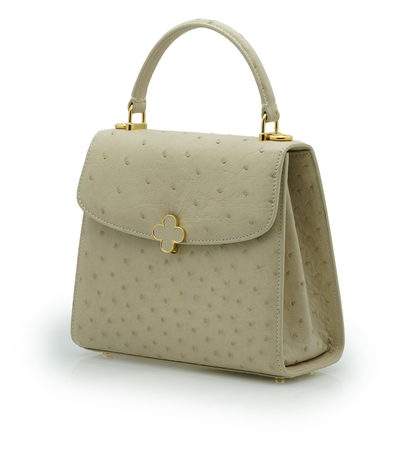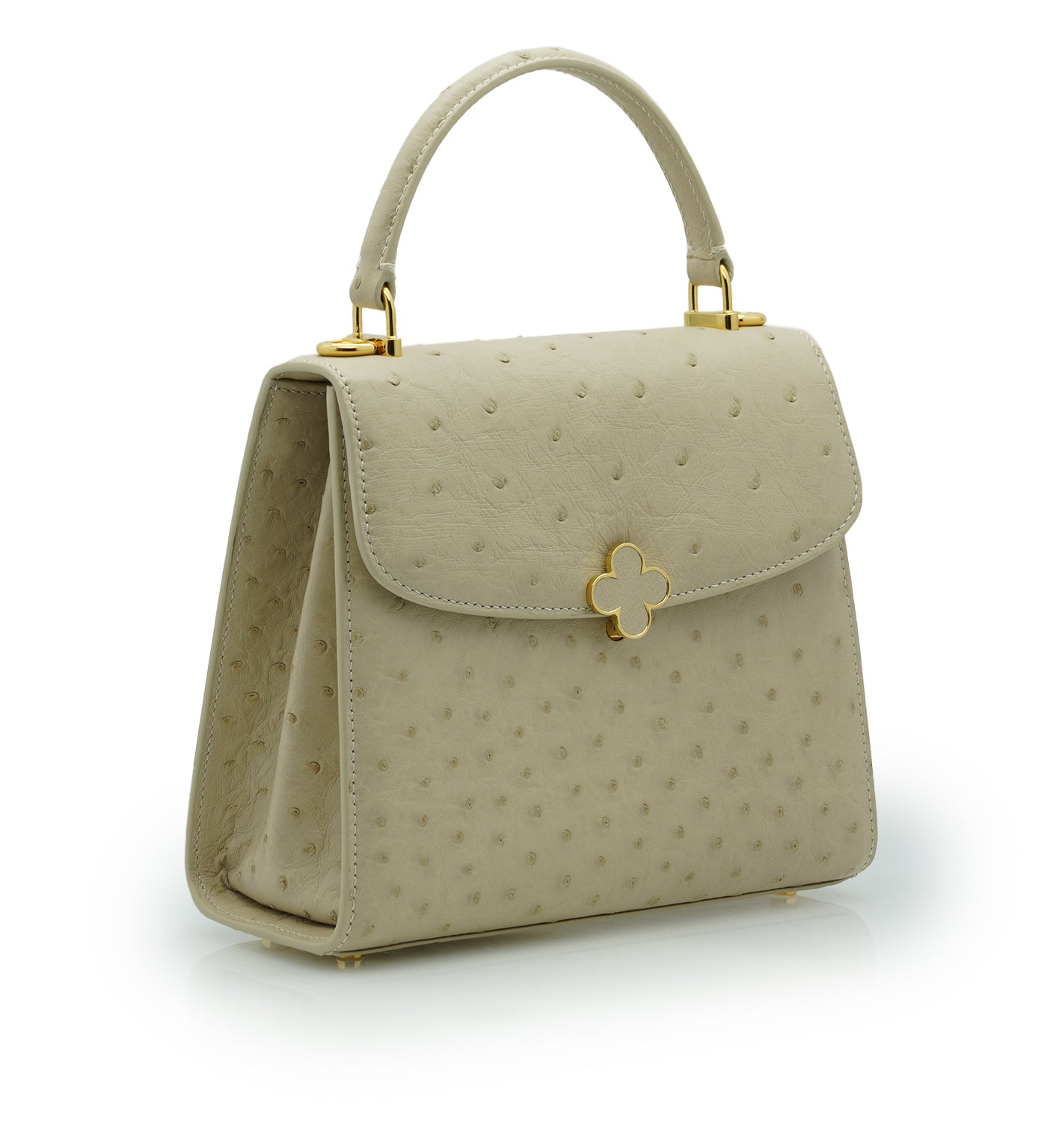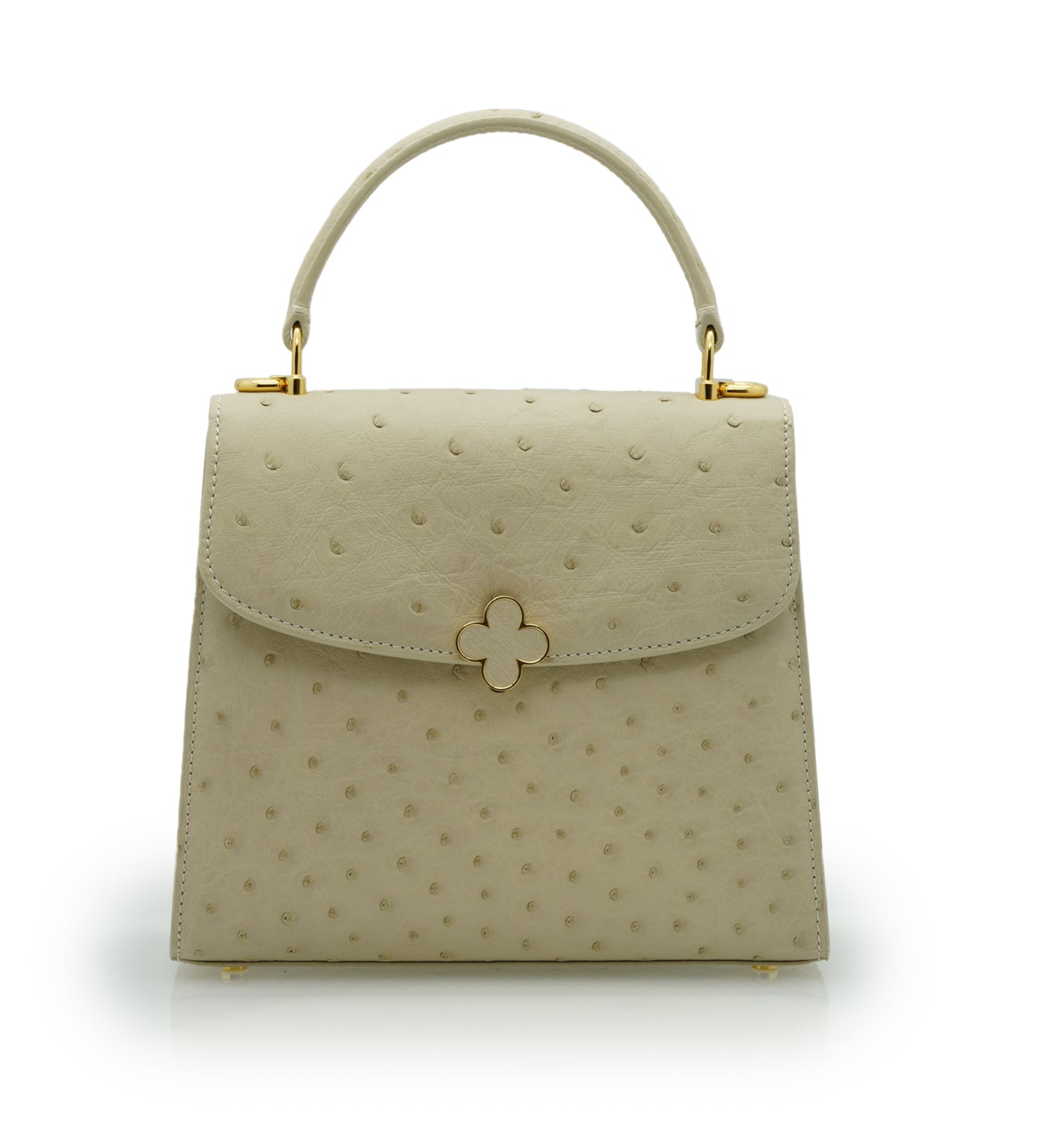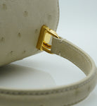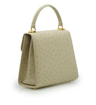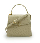 Cardinal signature Tiffany top handle bag is perfect accessory to wear cross seasons. This bag in medium size is perfect for daily use in any occasion, you can meeting with friends, walking around the city, traveling, shopping while feel light and fashionable. This timeless bag has been realized in Milano by experted artisans in clean elegant shape. It is handcrafted from genuine ostrich leather in elegant beige color, detailed with Cardinal brand flower clip lock. The top handle is comfortable for hand or elbow carry and a removable strap for over-the-shoulder wear. The bag is roomy enough for your essentials like small wallet, keys and make up. A special Cardinal clasp keeps your essentials safe, there is one internal pocket.